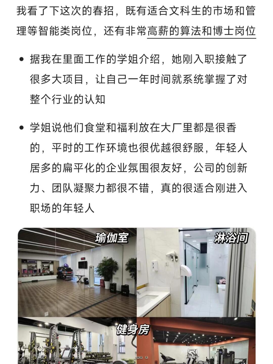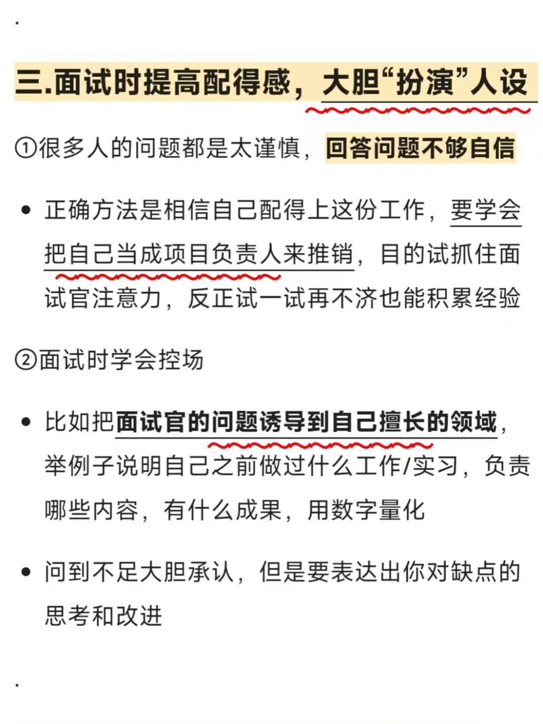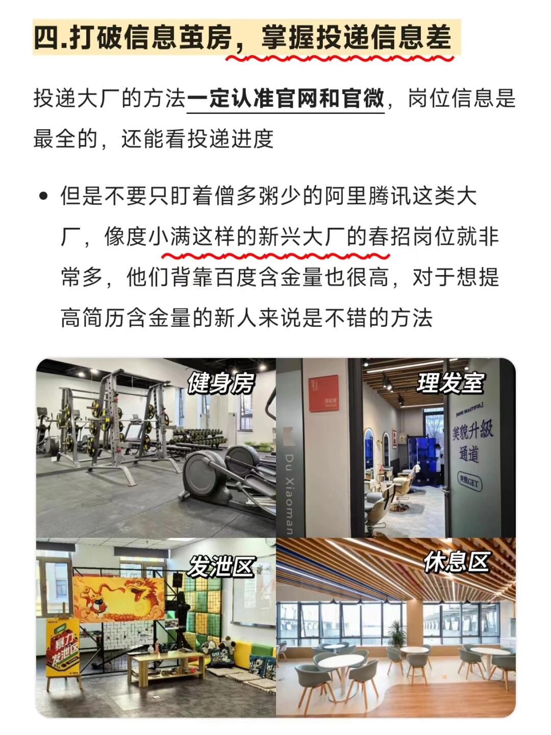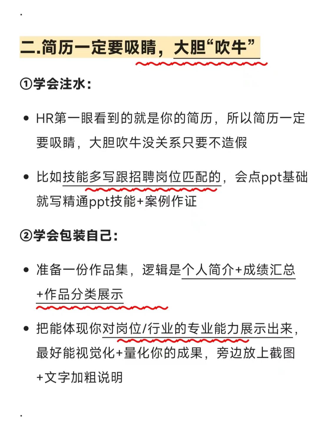 我大学时靠二本学历拿到大厂offer,每次实习都被leader要求留任,我发现自己每份工作都是我们组里学历最差的,他们的背景包括但不限于本硕南大、交大博士等等。我的找工作秘诀可以浓缩成一句话:胆子越大,offer越好! · ❶掌握方法:普通人如何找到高薪工作 方法①:按照关键词检索行业研报,拎出“产业链”这一页,能迅速看到行业的上中下游公司名称,然后去这些公司官网或者公主号定向投递,比各大app投递更高效 . 方法②:在某音/某信上检索“城市+月份+展会”,挑选感兴趣的行业直接奔赴展会现场,如今的形势下有能力办展会的都是有实力企业,人流量代表受欢迎程度 . 方法③:搜全国行业展会+参展商名单,参展商基本上就是招聘的企业,展会上尝试与营销人员和负责人沟通工作和后续内推 . ❷简历一定要吸睛,大胆“吹牛” ①学会注水:HR第一眼看到的就是你的简历,所以简历一定要吸睛,大胆吹牛没关系只要不造假。比如技能多写跟招聘岗位匹配的,会点ppt基础就写精通ppt技能+案例作证 . ②学会包装自己:准备一份作品集,逻辑是个人简介+成绩汇总+作品分类展示。把能体现你对岗位/行业的专业能力展示出来,最好能视觉化+量化成果,旁边贴截图+文字加粗说明 . ❸面试时提高配得感,大胆“扮演”人设 ①面试时很多人的问题是太谨慎、回答不自信,我的秘诀是相信自己配得上这份工作,学会把自己当成项目负责人来推销,目的是抓住面试官注意力,反正再不济也能积累经验 . ②面试时学会控场,比如把面试官问题诱导到自己擅长领域,举例子说明自己之前做过什么工作/实习,负责哪些内容,有什么成果,用数字量化。问到不足大胆承认,但是要表达出你对缺点的思考和改进 . ❹打破信息茧房,掌握投递信息差 投递大厂认准官网和官微,但不要只盯着僧多粥少的阿里腾讯,像度小满这类新兴大厂春招岗位非常多,背靠百度含金量很高。既有适合文科生的市场和管理岗,还有高薪算法和博士岗位。据我在里面工作的学姐说,食堂和福利放在大厂里都很香,平时工作环境很优越很舒服,年轻人居多的扁平化企业氛围,很适合刚进入职场年轻人,建议大家掌握好信息差不要错过