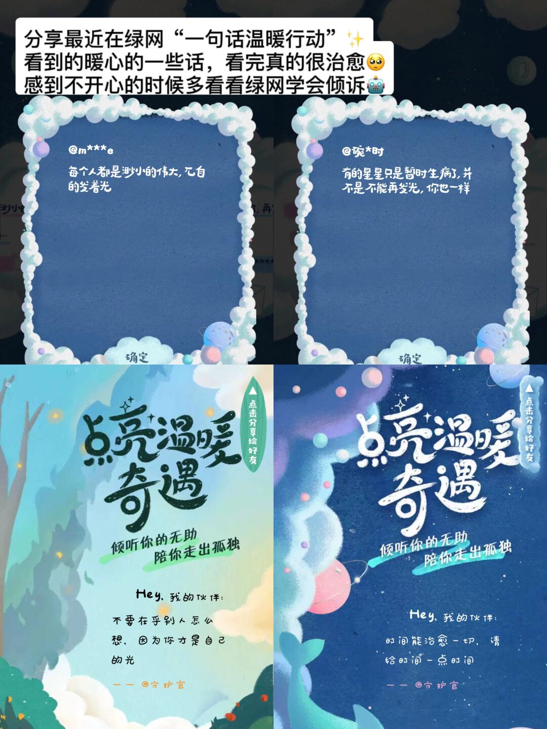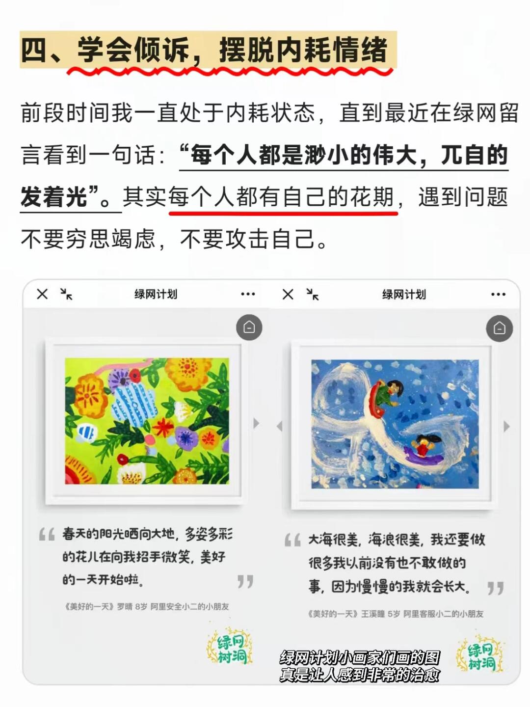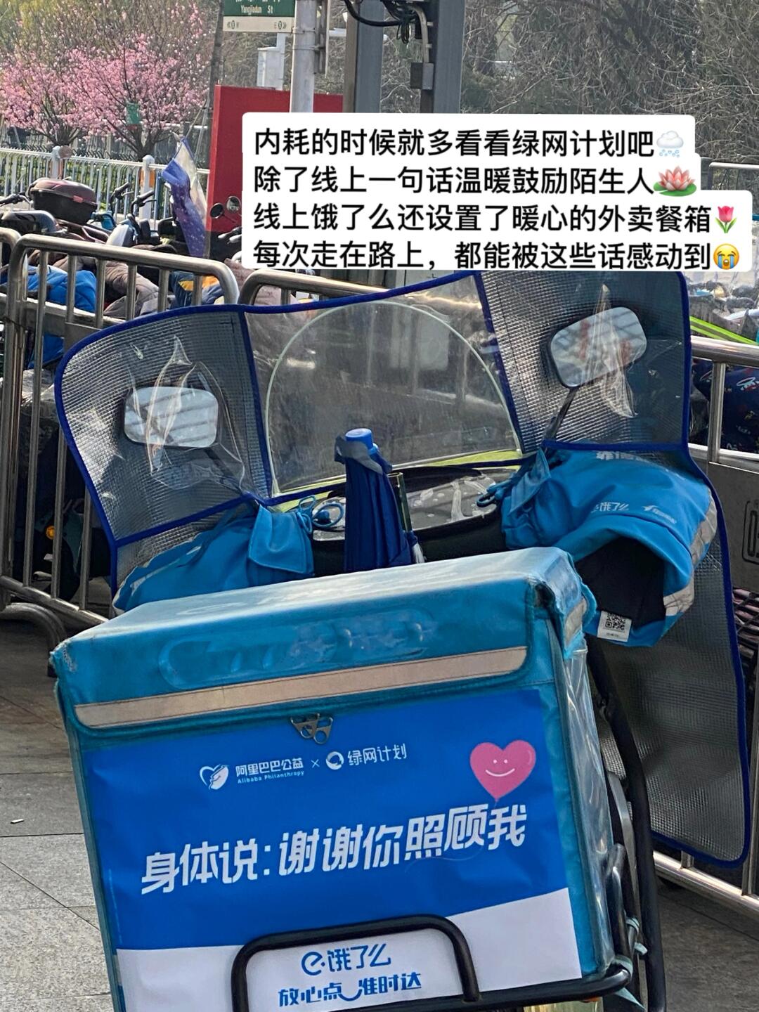 我大学遇到一个拯救我的贵人,她是我们学院传奇人物。 . 高考被录取到传媒专业,她大一就考到专业第一名,却转专业到汉语言专业。结果她大二又考到该专业第一名,令人震惊的是大四她三跨去了某985大学读研。 . 我发现她身上最大特点是:从来不为自己预设困难,想转专业就看清本质吃透文件、专业还不喜欢就直接跨专业考研。大学四年她总是能量满满,不会被任何小事影响,也没有乱七八糟的情绪。事成后就奖励自己旅游、打游戏、逛街 · ❶不要预设困难 我大学是个很拧巴的人,想保研又觉得二本保研很难,整天垂头丧气预想最坏结果:没拿到保研名额怎么办?面试歧视二本怎么办?后来我发现不要犹豫、主动争取才能杀死低能量 . 于是我:① 自荐进入老师课题组:参与论文和大创,跟学长学姐比赛拿奖,靠竞赛排名专业前3名,拿到一等奖学金;②找到保研学姐:询问学习方法、规划,我模仿并制定自己的规划,大四也上岸北外研究生 . ❷戒掉不配得感 我大一排名专业89,大二却综测前3名。那时我意识到:别因为成绩差就觉得自己不配,找到匹配的领域才能实现自我价值,比如: . ① 我朋友成绩不好没考研,但用3年实习经历入职大厂;②虽然我成绩一般,但依靠比赛加分保研北外;③我学弟本科绩点低,却擅长比赛和论文,研究生拿到专业第1名 . ❸学会布局主线任务 大学要抓主要矛盾,如果你目标是读研,那就把专业课学扎实搞定考研初试,积累大创、社会实践、挑战杯等项目应对考研复试;如果目标是工作,那就把ppt、透视表、数据分析等技能学好,多积累实习项目经验,秋招翻盘 . ❹学会倾诉,摆脱内耗情绪 前段时间我一直处于内耗状态,直到最近在绿网留言看到一句话:“每个人都是渺小的伟大,兀自的发着光”。其实每个人都有自己的花期,遇到问题不要穷思竭虑、不要攻击自己,实在沮丧焦虑就看看阿里巴巴绿网计划公益项目,为被负面情绪包围的盆友设计的关爱心理健康专项——“点亮温暖奇遇”页面,如果存在心理问题可以看科普视频,遇到问题就打24小时免费心理咨询热线 . 我线上看到的话就来自于“一句话温暖行动”,这是中绿网三月的活动,他们在饿了么外卖餐箱上线了一句句十分温暖的鼓励话语,感兴趣可以在上海杭州两地打卡看看