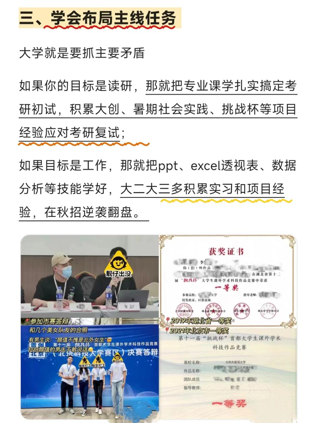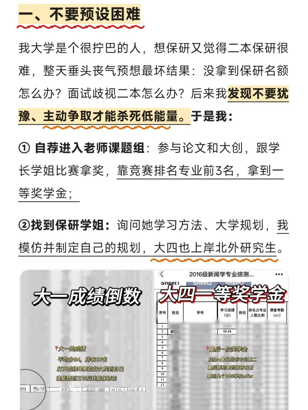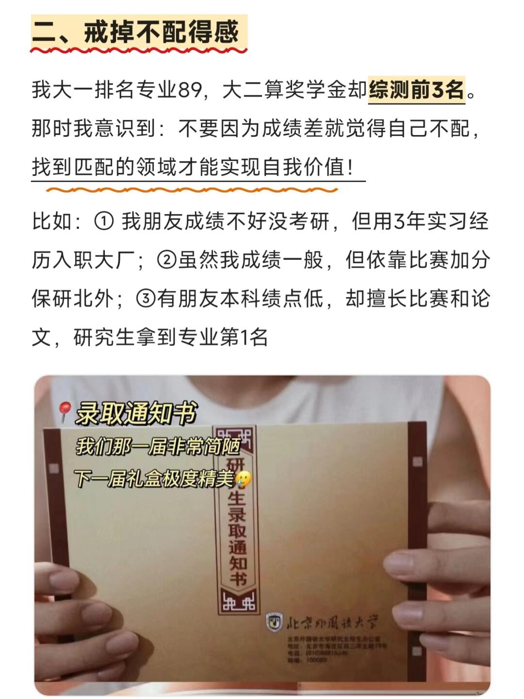 我大学遇到一个拯救我的贵人,她是我们学院传奇人物。 . 高考被录取到传媒专业,她大一就考到专业第一名,却转专业到汉语言专业。结果她大二又考到该专业第一名,令人震惊的是大四她三跨去了某985大学读研。 . 我发现她身上最大特点是:从来不为自己预设困难,想转专业就看清本质吃透文件、专业还不喜欢就直接跨专业考研。大学四年她总是能量满满,不会被任何小事影响,也没有乱七八糟的情绪。事成后就奖励自己旅游、打游戏、逛街 · ❶不要预设困难 我大学是个很拧巴的人,想保研又觉得二本保研很难,整天垂头丧气预想最坏结果:没拿到保研名额怎么办?面试歧视二本怎么办?后来我发现不要犹豫、主动争取才能杀死低能量 . 于是我:① 自荐进入老师课题组:参与论文和大创,跟学长学姐比赛拿奖,靠竞赛排名专业前3名,拿到一等奖学金;②找到保研学姐:询问学习方法、规划,我模仿并制定自己的规划,大四也上岸北外研究生 . ❷戒掉不配得感 我大一排名专业89,大二却综测前3名。那时我意识到:别因为成绩差就觉得自己不配,找到匹配的领域才能实现自我价值,比如: . ① 我朋友成绩不好没考研,但用3年实习经历入职大厂;②虽然我成绩一般,但依靠比赛加分保研北外;③我学弟本科绩点低,却擅长比赛和论文,研究生拿到专业第1名 . ❸学会布局主线任务 大学要抓主要矛盾,如果你目标是读研,那就把专业课学扎实搞定考研初试,积累大创、社会实践、挑战杯等项目应对考研复试;如果目标是工作,那就把ppt、透视表、数据分析等技能学好,多积累实习项目经验,秋招翻盘 . ❹学会倾诉,摆脱内耗情绪 前段时间我一直处于内耗状态,直到最近在绿网留言看到一句话:“每个人都是渺小的伟大,兀自的发着光”。其实每个人都有自己的花期,遇到问题不要穷思竭虑、不要攻击自己,实在沮丧焦虑就看看阿里巴巴绿网计划公益项目,为被负面情绪包围的盆友设计的关爱心理健康专项——“点亮温暖奇遇”页面,如果存在心理问题可以看科普视频,遇到问题就打24小时免费心理咨询热线 . 我线上看到的话就来自于“一句话温暖行动”,这是中绿网三月的活动,他们在饿了么外卖餐箱上线了一句句十分温暖的鼓励话语,感兴趣可以在上海杭州两地打卡看看