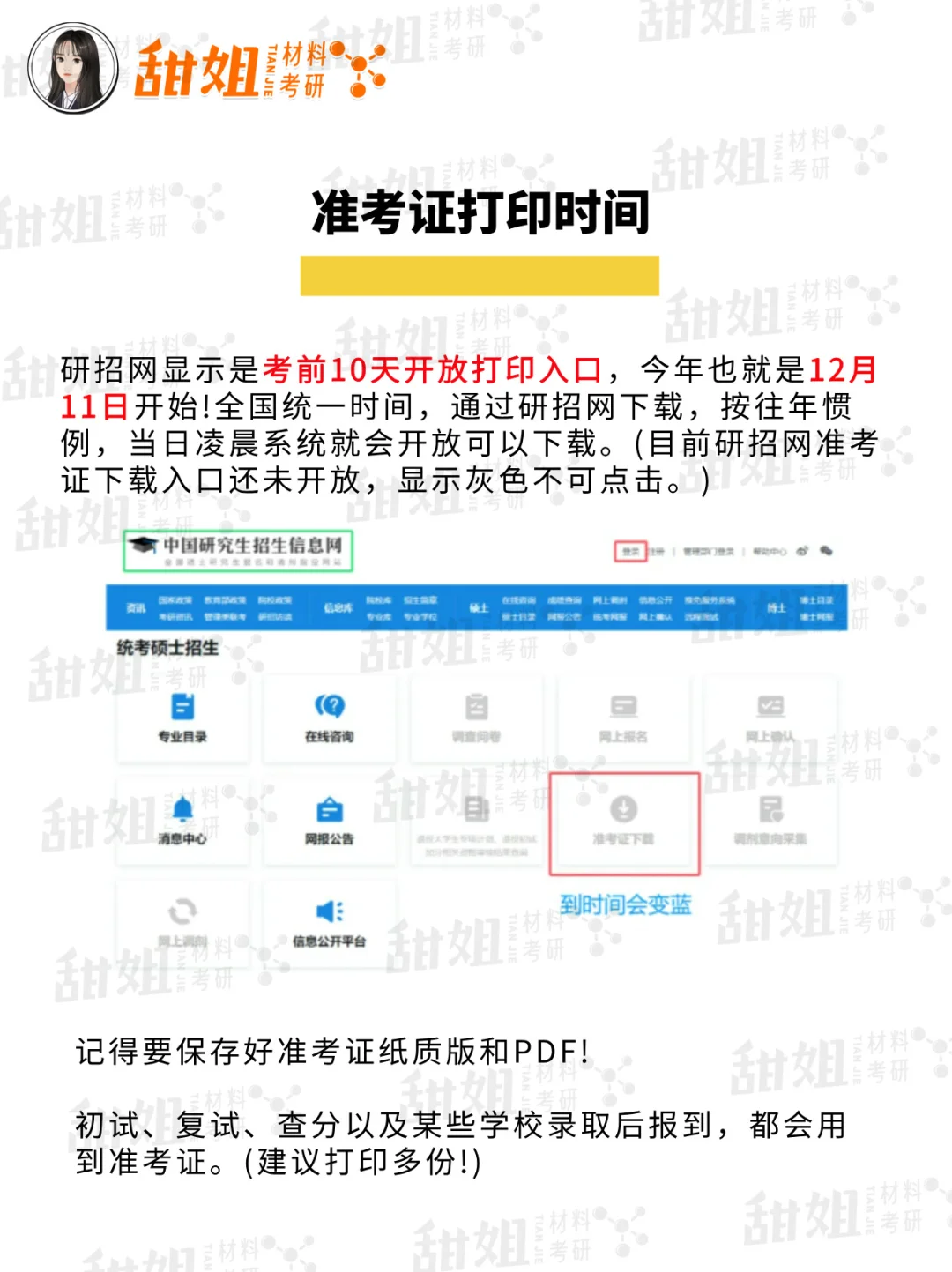 今年的12月11日起,准考证打印窗口将正式开启! (目前,下载入口还是灰色的,耐心等待吧!) 记得要保存好准考证纸质版和PDF! 初试、复试、查分以及某些学校录取后报到,都会用到准考证。(建议打印多份!) 打印流程 🖥️ ➡ 登录研招网,点击登录——进入用户中心——点击准考证下载。 25考研 材料考研 准考证打印 准考证 准考证打印时间 打印准考证 材料与化工 材料科学与工程 考研倒计时 考研准考证