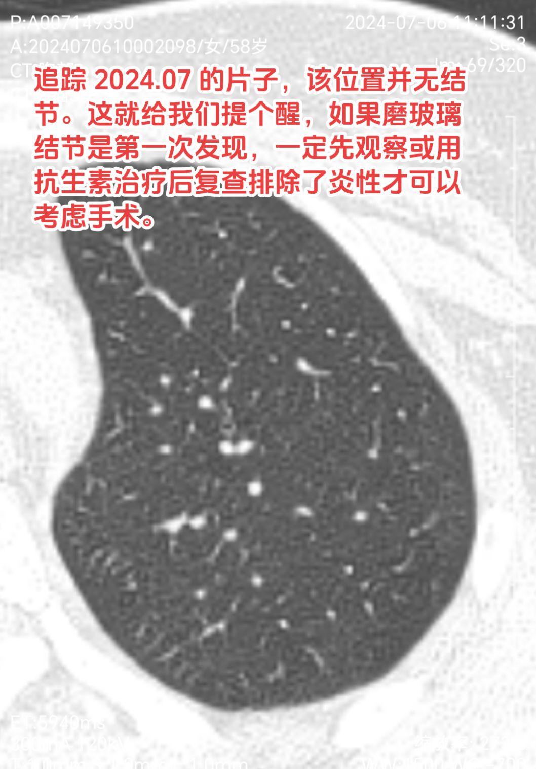 这类磨玻璃结节很大可能是炎性!该患者例行体检行胸部 CT 发现左上肺 9mm 的磨玻璃结节,仅从影像学特征上看确实不怎么好。但患者有每年体检的习惯,所以自行前往去年体检的医院找到电子版片子,对比发现该结节在 2024.07 并没有。从肿瘤的生长速度判断,这类磨玻璃结节大概率是炎性。追踪 2024.07 的片子,该位置并无结节。这就给我们提个醒,如果磨玻璃结节是第一次发现,一定先观察或用抗生素治疗后复查排除了炎性才可以考虑手术。