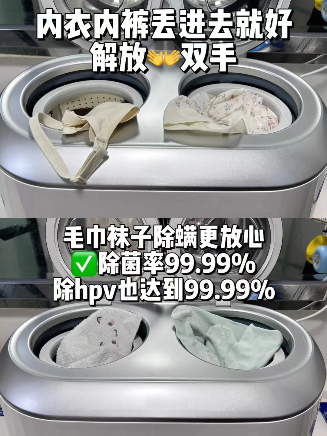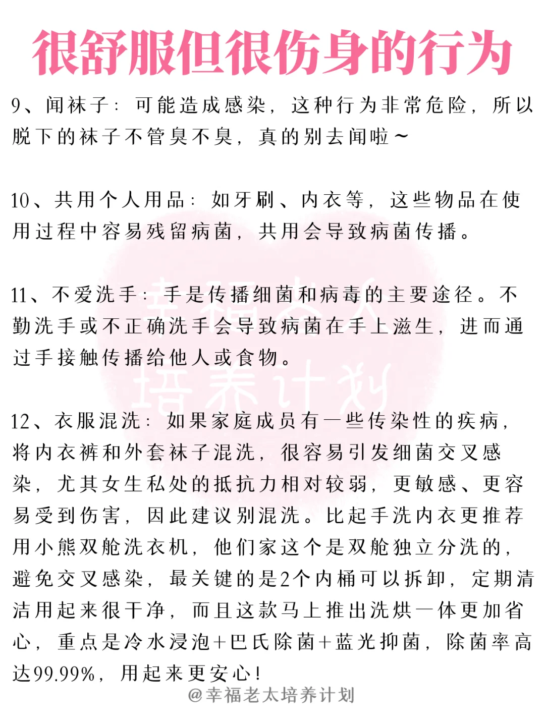 12、衣服混洗:如果家庭成员有一些传染性的疾病,将内衣裤和外套袜子混洗,很容易引发细菌交叉感染,尤其女生私处的抵抗力相对较弱,更敏感、更容易受到伤害,因此建议别混洗。比起手洗内衣更推荐用小熊双舱洗衣机,他们家这个是双舱独立分洗的,避免交叉感染,最关键的是2个内桶可以拆卸,定期清洁用起来很干净,而且这款马上推出洗烘一体更加省心,重点是冷水浸泡+巴氏除菌+蓝光抑菌,除菌率高达99.99%,用起来更安心!