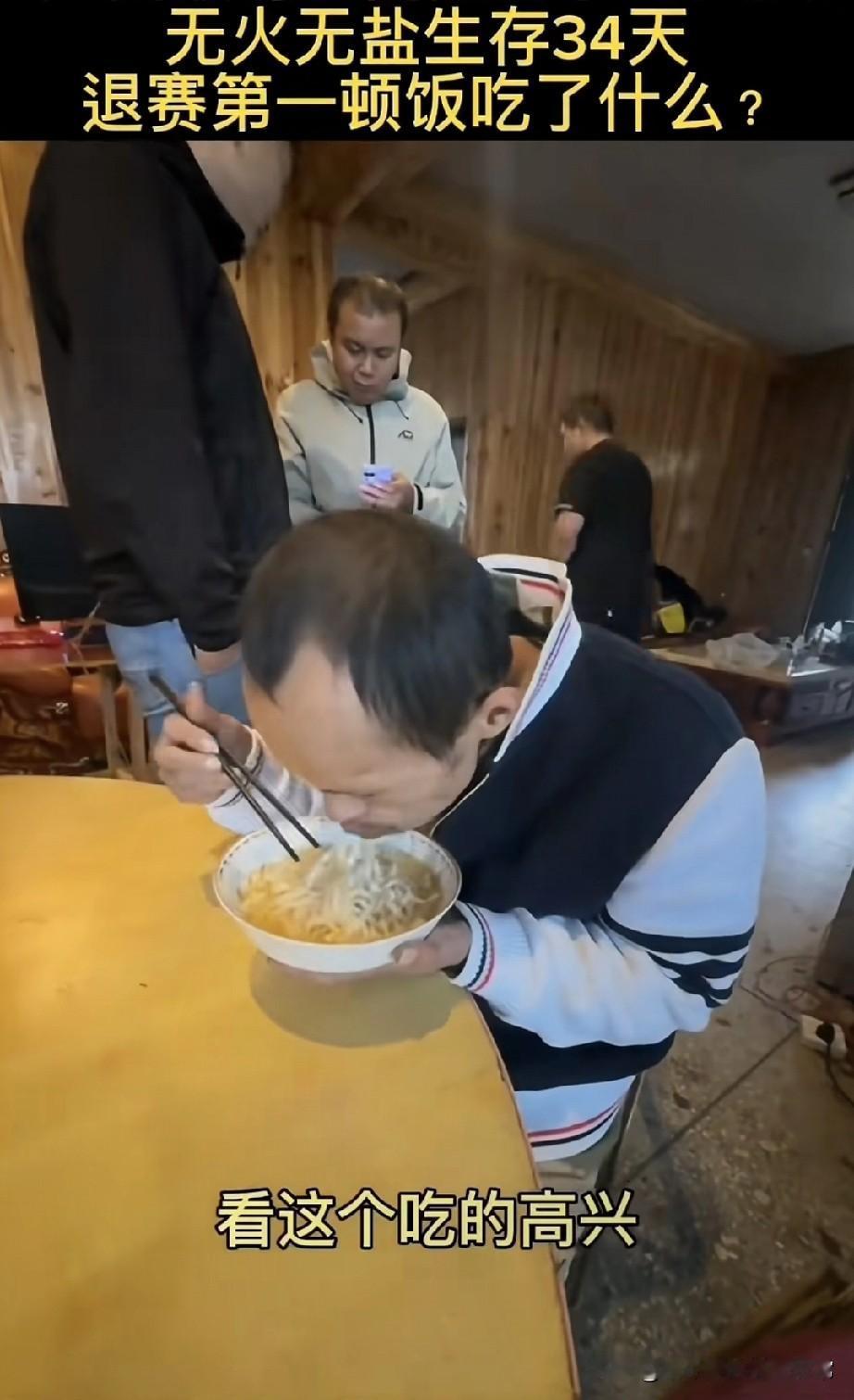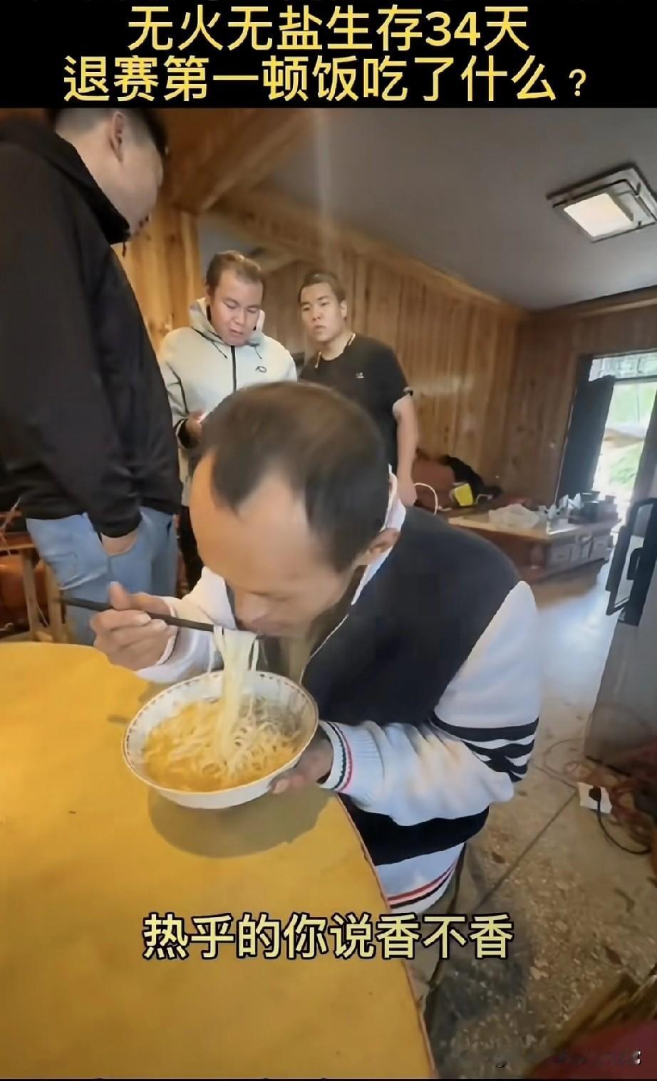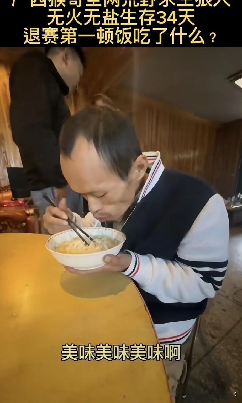 广西猴哥荒野求生34天,退赛第一顿吃这玩意儿,嘴都嗦歪了! 谁看了不懵啊家人们!广西猴哥在湖南那比赛里,无火无盐硬扛34天,瘦得眼窝都凹进去了,退赛直奔小馆子,端起一碗汤面直接往嘴里炫—— 筷子搅都不搅,连汤带面往嘴里扒,腮帮子塞得鼓鼓的,嗦面嗦得嘴角挂汤,旁边人问“香不香”,他头都不抬,含糊着嘟囔“美味”,那吃相恨不得把碗都啃了! 34天没碰热乎饭,一碗普通汤面能给他香成这样?换你们饿半个月,是不是啃馒头都觉得是山珍海味? 但话说回来,这比赛真能让人饿成这样?还是演的啊?