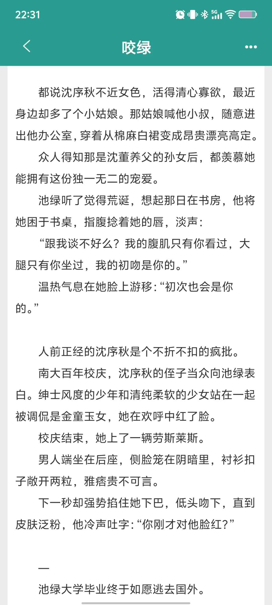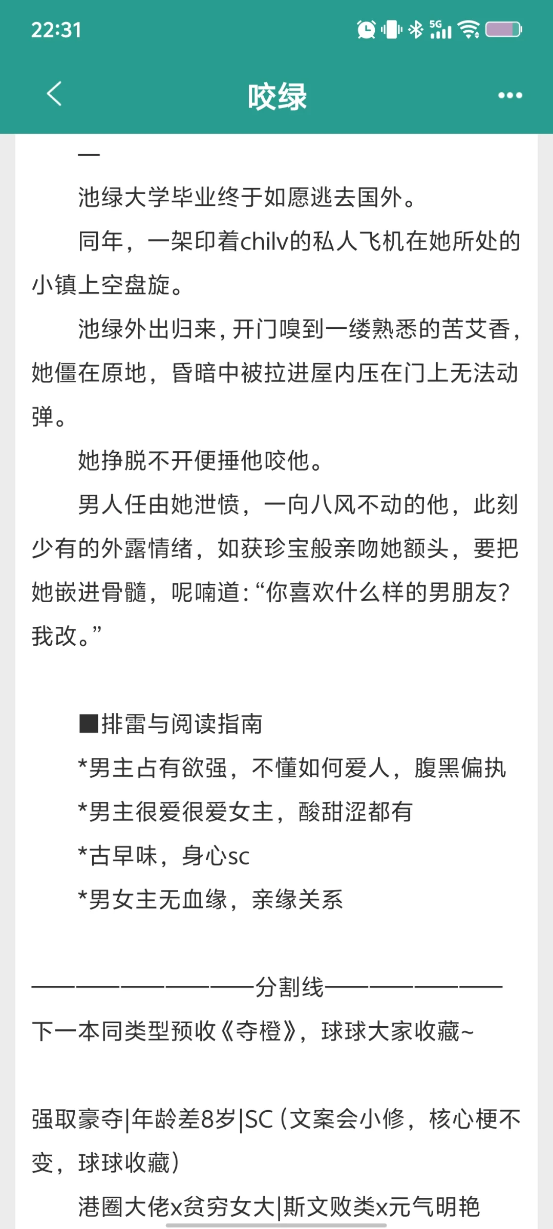 《咬绿》by虞灯灯 刚完结的文,一共78章 这本正文已经完结!可以冲拉! 是强取豪夺/墙纸爱/年龄差7岁/体型差!喜欢强取豪夺,上位者低头求爱的宝宝们一定要去看啊!男主一开始为爱发疯发癫超级带感,后面发现女主逃离他后开始攻心,卑微求女主喜欢他!