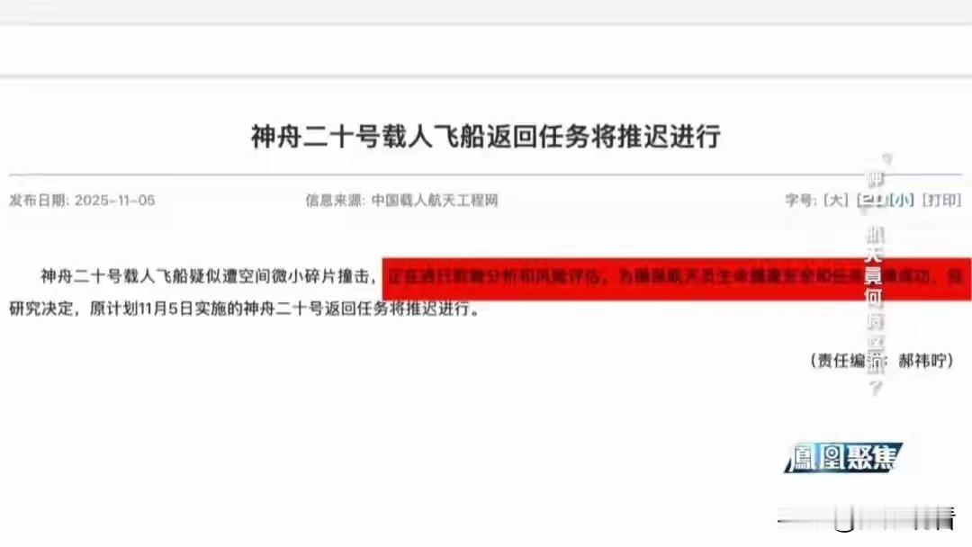 航天员安全如何保障? 😱神二十延迟返航!航天员安全早有“多重保险”,完全不用慌! 我刷到神二十疑似遭太空碎片撞击、延迟返航的消息了,一开始真的捏把汗,但了解完中国航天的硬核保障,瞬间安全感拉满🇨🇳 咱航天人早就把风险想到前面,安全防护直接拉满buff✨ 1. 太空“铠甲”护体:飞船有复合防护结构,能粉碎微小碎片,空间站密封舱更是能扛住1.3厘米级撞击,关键部件坏了也不影响整体! 2. 救援方案“三保险”:地面备用飞船随时待命,一周内就能发射救援;还能换乘神舟二十一号,或等后续飞船接人,总有退路! 3. 在轨物资管够:水再生率超95%,食品药品够吃数月,医疗急救包、专用药一应俱全,生活医疗都不愁。 4. 天地实时守护:地面靠测控站、中继卫星24小时监测,飞船也有撞击监测系统,有问题能及时修,必要时还能出舱修复! 我觉得中国航天的安全感从来不是说说的,每一步都稳扎稳打!为中国航天点赞,期待航天员们平安返航,顺利回家。