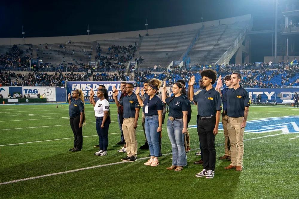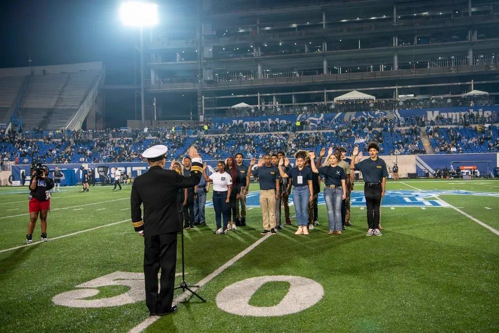 美国宣誓文化已经泛滥成灾,任何场合都可以宣誓。 在11月7日的一场橄榄球比赛中准备宣誓入伍的美国人。这些包括跨越田纳西、肯塔基、弗吉尼亚、阿拉巴马、密西西比、阿肯色和乔治亚州的46个美军海军招募站录取新兵,覆盖13.8万平方英里。