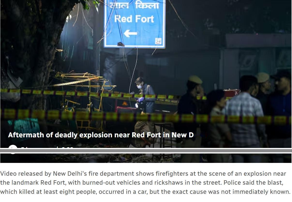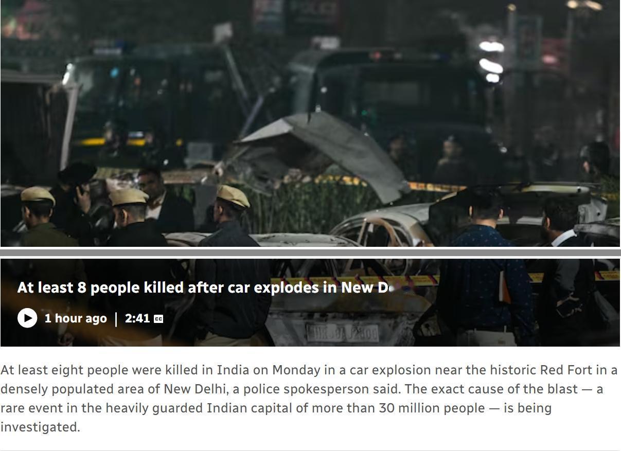 印度首都发生汽车爆炸事件,至少8人死亡 当地时间周一,印度首都新德里历史悠久的红