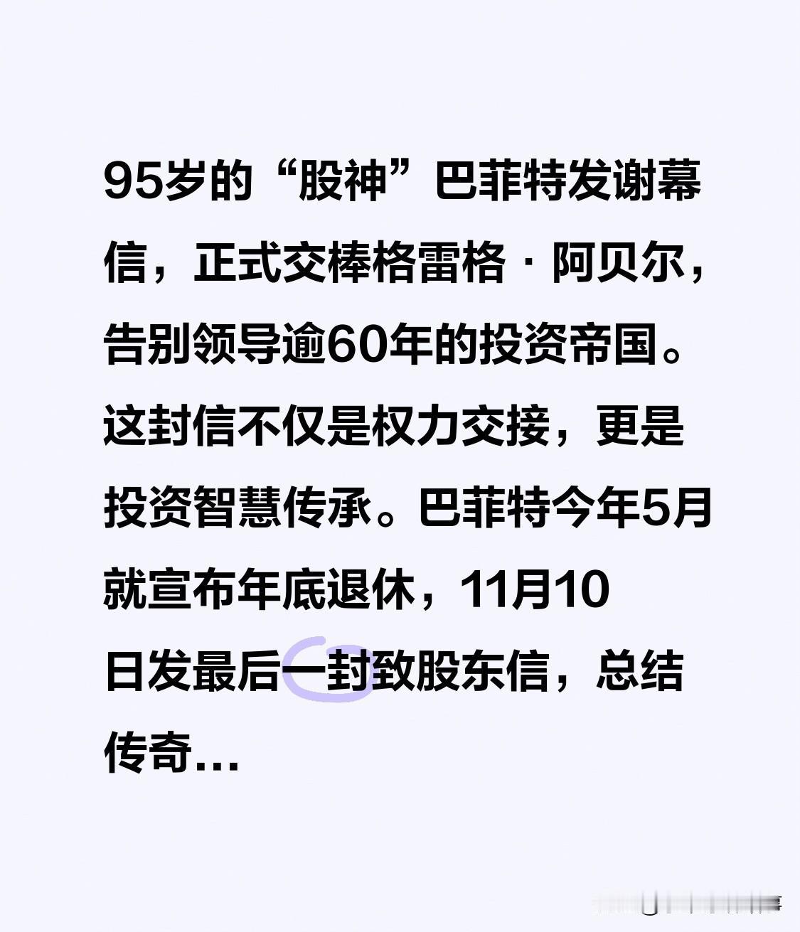 95岁的“股神”巴菲特发谢幕信,正式交棒格雷格·阿贝尔,告别领导逾60年的投资帝国。这封信不仅是权力交接,更是投资智慧传承。 巴菲特今年5月就宣布年底退休,11月10日发最后一封致股东信,总结传奇一生。他加速向子女基金会捐赠,留相当数量伯克希尔A类股份助阿贝尔赢股东信心。他评价阿贝尔是出色管理者、勤奋工作者与坦诚沟通者。 信中重申价值投资核心,手握3810亿美元现金等良机,还警示市场狂热。他虽卸任,但投资智慧会一直影响着市场。