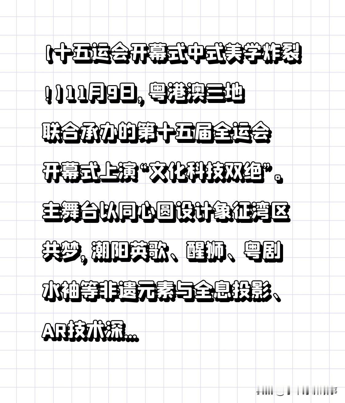 震惊!【十五运会开幕式,中式美学惊艳全场!】11月9日,由粤港澳三地联合承办的第十五届全运会开幕式,实现“文化科技双绝”。主舞台采用同心圆设计,寓意湾区共筑梦想。潮阳英歌、醒狮等非遗元素与全息投影等技术深度融合,龙舟“划”入观众席,机器人敲响句鑃。民间工艺焕新,三地同升国旗,尽显家国情怀,帧帧中式美学,秒秒中国浪漫!