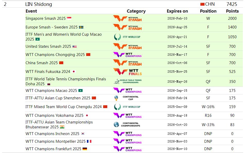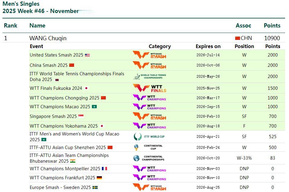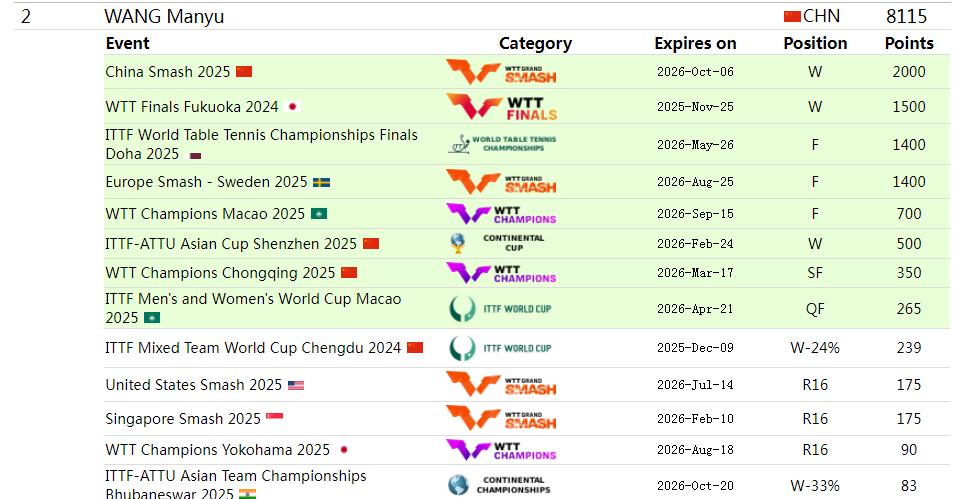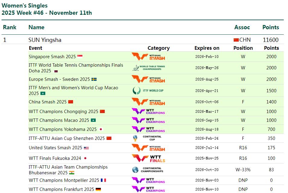 好消息!国际乒联最新世界排名中,国乒四大主力都没有被赋0.本来呢,按照WTT的规则,每年的6站冠军赛中有至少有4站比赛是强制参赛的,只有2次豁免权。如果入围了而没有参赛的次数达到3次的话,是要被赋0且罚款的。 而国乒的四大主力孙颖莎、王曼昱、王楚钦、林诗栋今年没有参加仁川冠军赛、蒙彼利埃冠军赛、法兰克福冠军赛,按理来法兰克福这站比赛是要被赋0的且罚款5000美元的。但是在国际乒联公布的最新世界排名中国,这四人都没有被赋0。原因暂时不清楚,但对于国乒来说肯定是好消息了。 此外,最新一期的女单世界前10中,第4到第10的运动员都发生了变化。 男单方面,前十中,第8到第10的球员发生了变化。向鹏跌出了前十,而日本的松岛辉空则是生涯首次排名进入世界前十。