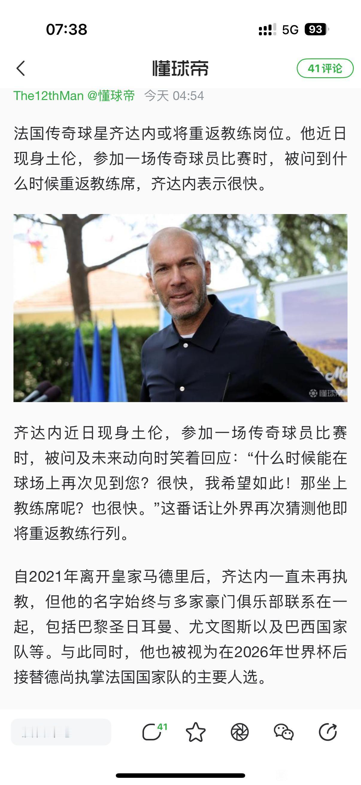 足坛大师齐达内说他很快将复出! 现在哪个欧洲豪门缺教练的可以行动了。 本来曼联缺教练,近期阿莫林都是英超最佳,无缘去曼联啦。 利物浦缺,斯洛特可能会下课! 切尔西也缺,我希望齐达内去英超多好。 意甲尤文图斯展望复兴,齐达内的老球队了。 如果在法甲也行,巴黎FC很有钱。 德甲是拜仁天下,拿不到欧冠孔帕尼下课,齐达内也能接任!![大金牙]