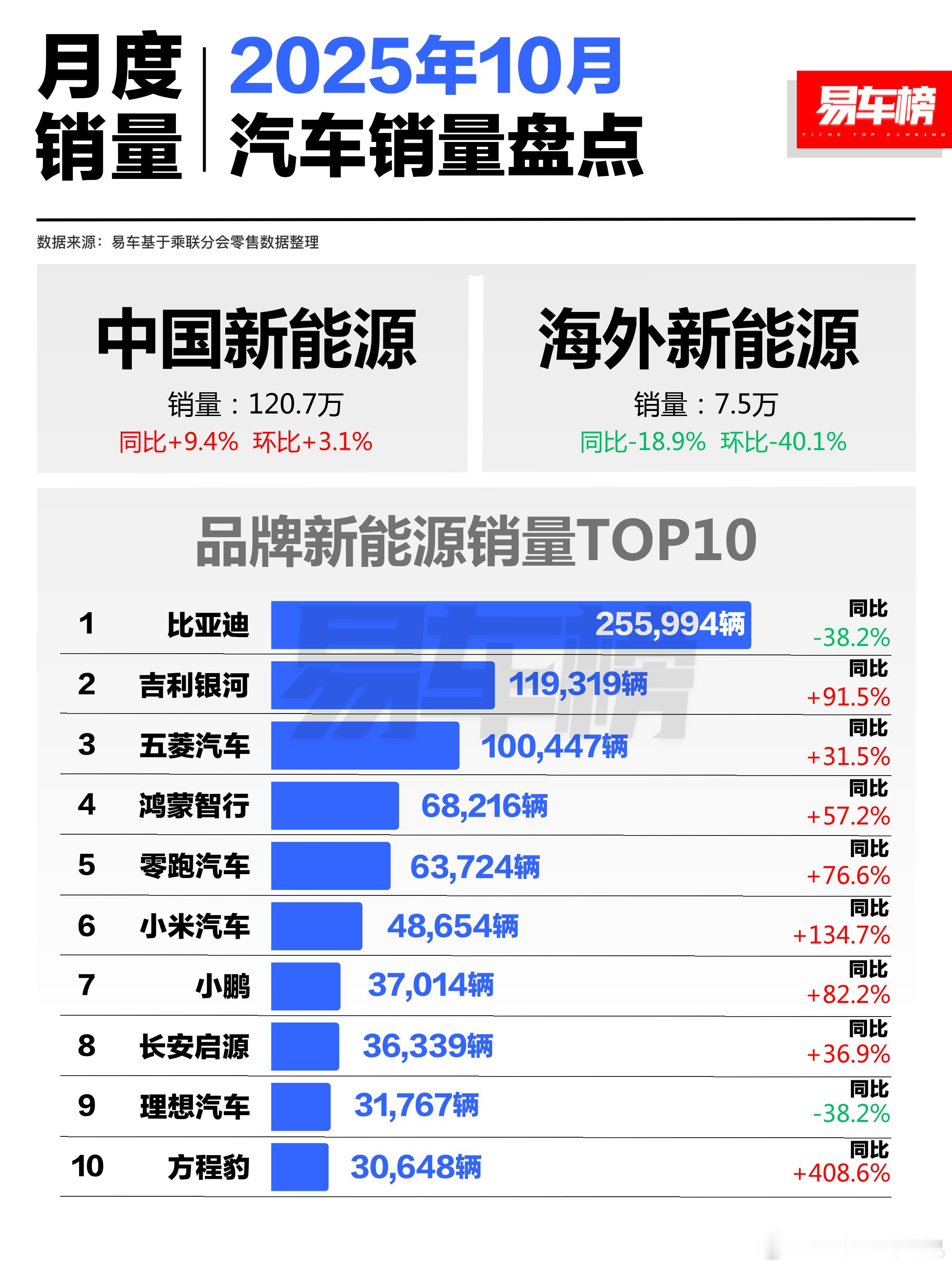 10月销量数据可视化信息。10月在比9月少了一周销售的情况下,环比仅仅下滑了0.1%。而日产现在重新回到了品牌榜前十名,超过了本田。另外新能源渗透率稳定在57.2%左右,感觉到了瓶颈了。