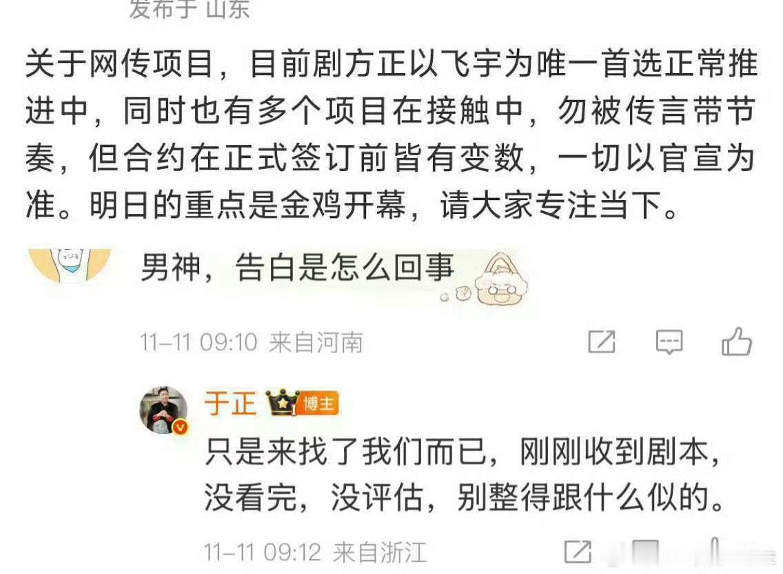 于妈又在说谎了,说刚刚收到剧本,没看完没评估。那五月份告白这个项目怎么就传的王星越了?我猜测是陈飞宇可能是临时有了别的项目,剧方去找了王星越做备选,哪知道被人马上爆料出来,剧方肯定是觉得陈飞宇最适合这个角色,所以马上出来表忠心“陈飞宇为唯一首选”