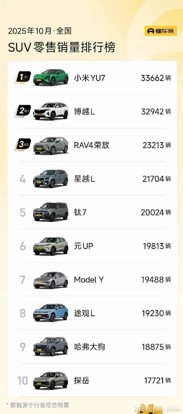 小米YU7数据排名出来了,10月全车型无定语销量第四,不区分价位和能源形式,SUV车型销量第一[举手]