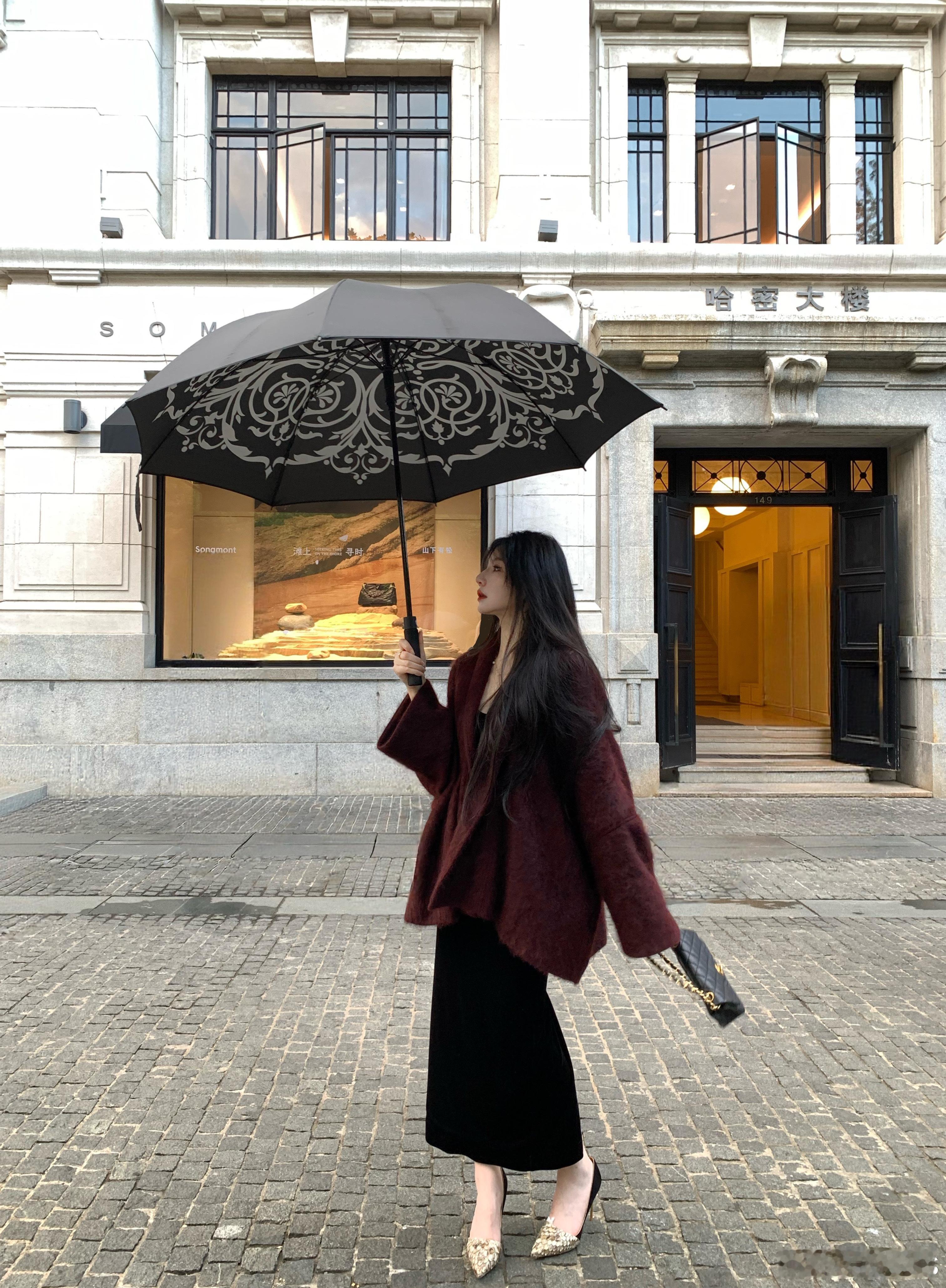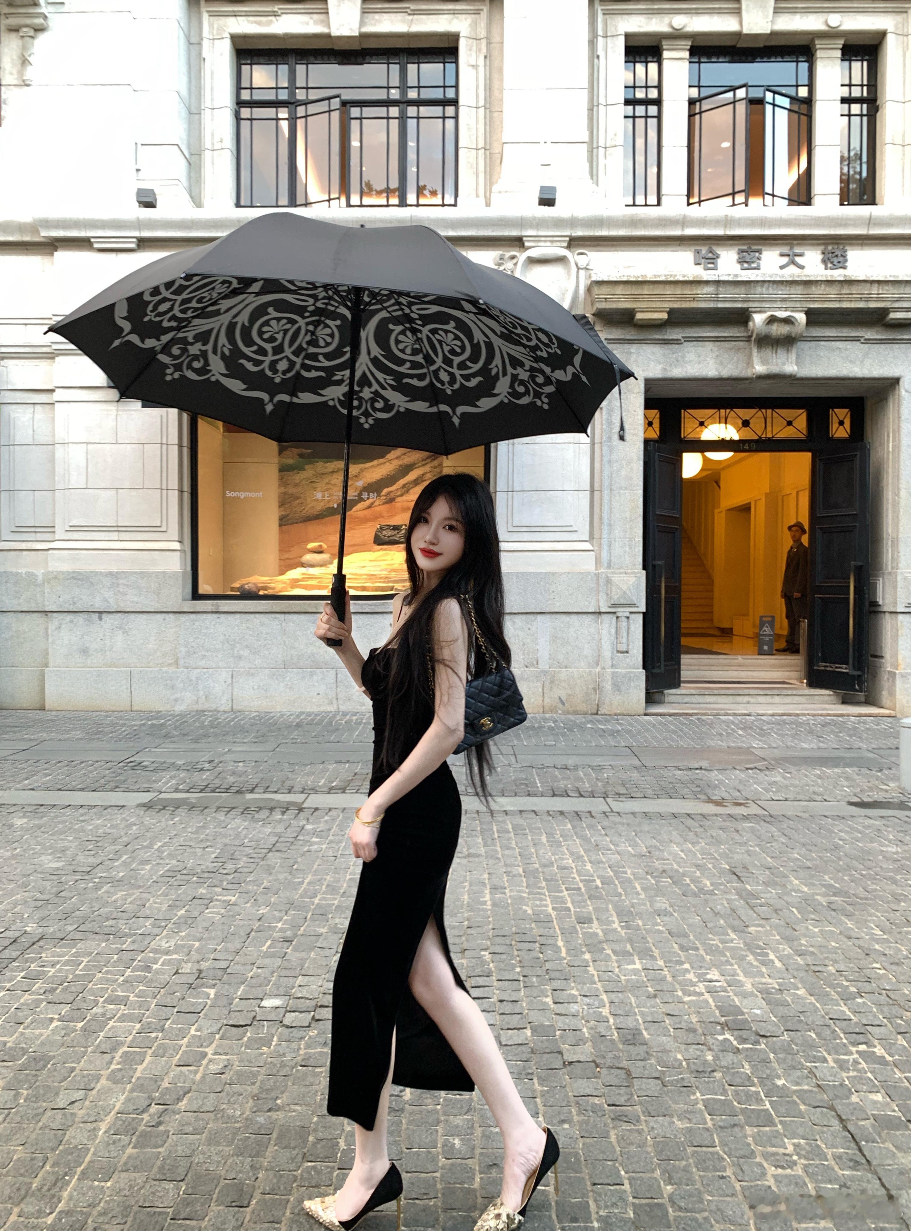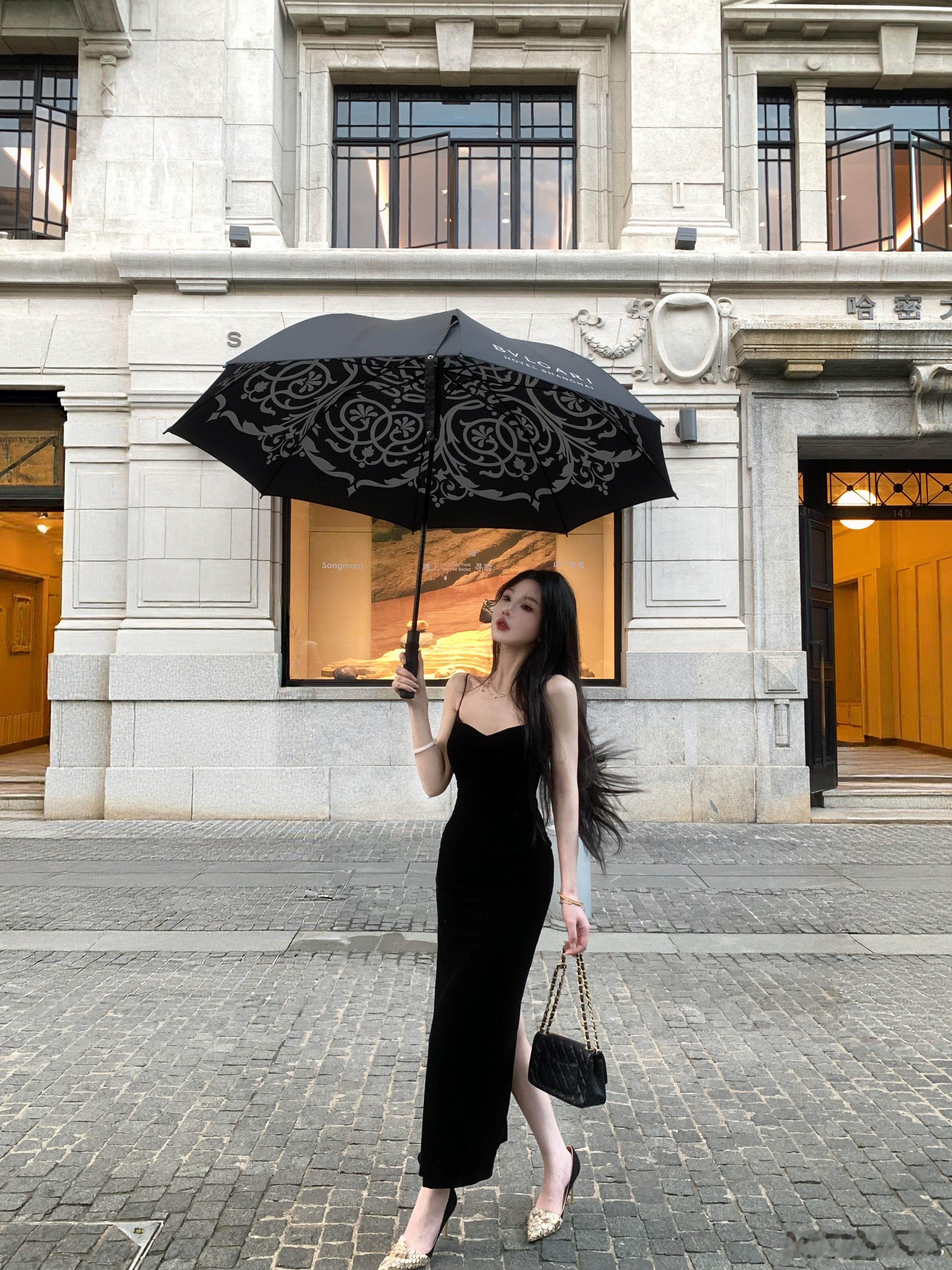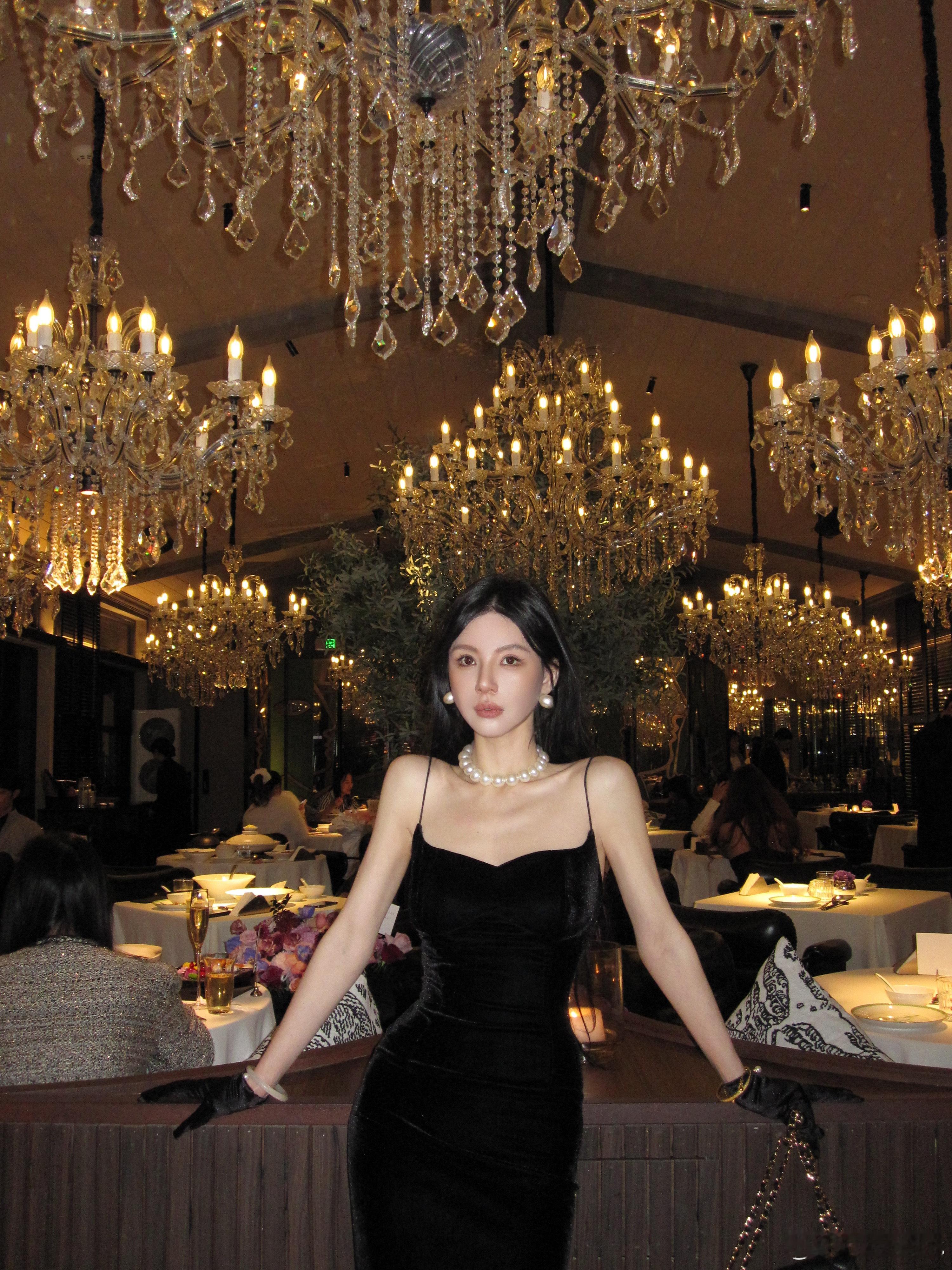 裙子👗采用了小方领吊带设计,将法式女性的柔美与干练完美融合👏丝绒的垂坠感极佳,贴合身形却毫无束缚感,搭配皮草外套演绎名媛风💅🏽单穿展现复古性感格调