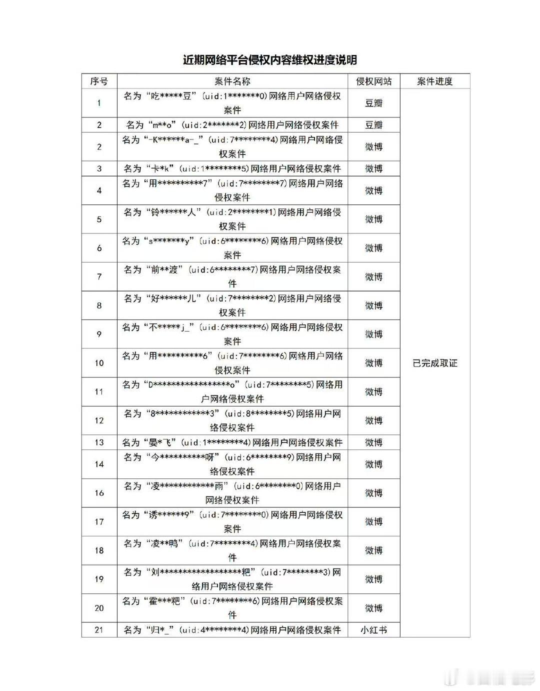 关于近期网络各平台侵权内容的维权进度说明