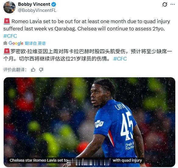 【拉维亚至少缺阵1个月】记者Bobby Vincent:在作客2比2战平卡拉巴赫的比赛受伤的切尔西后腰拉维亚,确认伤情为大腿股四头肌拉伤,将至少需要缺阵一个月的时间,切尔西医疗小组将会继续处理他的伤势。