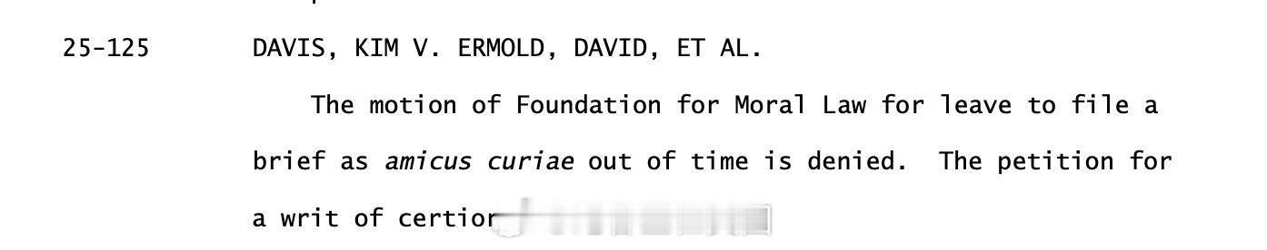 Davis因在2015年违抗法院命令、出于宗教信仰拒绝向同性伴侣颁发结婚许可而引发全国关注。她此前请求最高法院撤销下级法院裁定,要求她向一对被拒绝结婚许可的夫妇支付超过30万美元的赔偿,并希望推翻同性婚姻裁决。