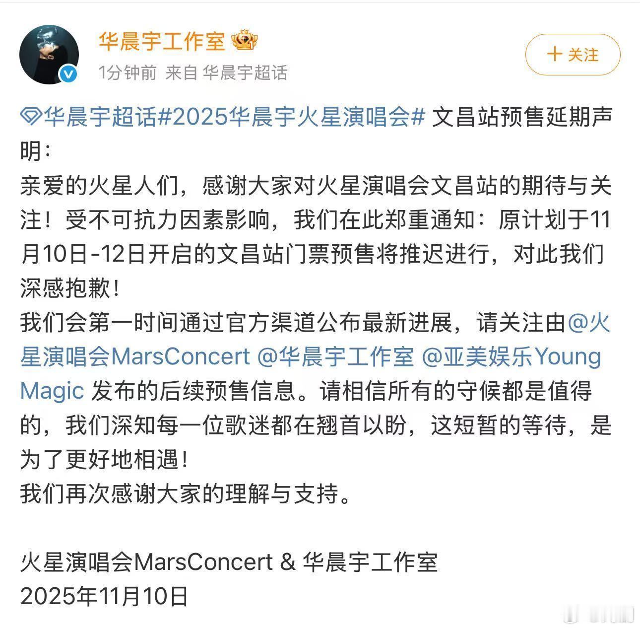 华晨宇 短暂等待为了更好的相遇 预售的延期是不可抗力因素造成的,但华晨宇始终在用心为大家准备最完美的演唱会,等待的每一秒都是值得的,最终的演出一定会更加精彩!