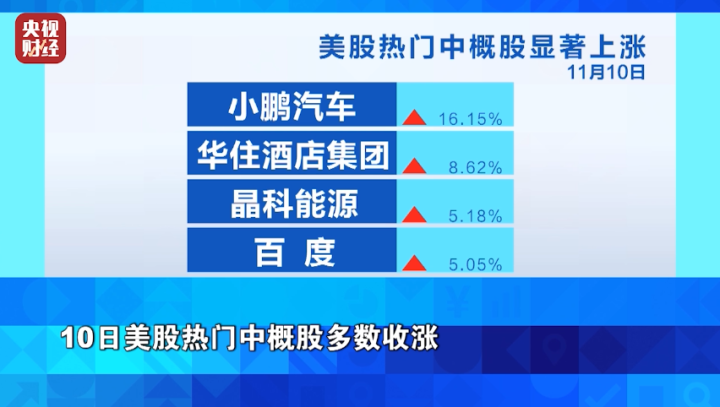 美股热门中概股周一多数上涨,推动中概股股指纳斯达克中国金龙指数收涨2.25%。个股方面,小鹏汽车大涨16.15%,华住酒店集团收涨8.62%,晶科能源收涨5.18%,百度收涨5.05%。