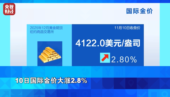 贵金属方面,美国联邦政府“停摆”期间,官方统计的经济数据缺失,而私营部门近期发布的就业数据显示,美国企业10月裁员数量大幅飙升,推动市场对美联储12月继续降息的预期升温,加之美元指数周一下跌,国际金价当天重新站上每盎司4100美元关口,涨至两周来高点。截至收盘,纽约商品交易所12月黄金期价收于每盎司4122.0美元,涨幅为2.8%。