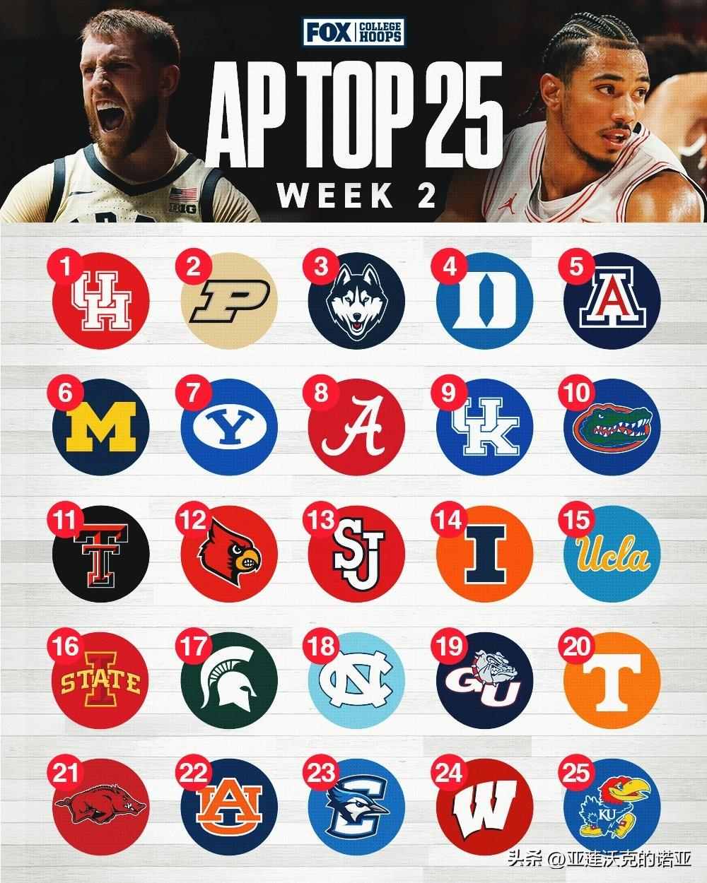 美联社公布第二周前25强榜单,休斯顿大学上涨至全美第一的位置,普度与康涅狄格大学紧随其后,官网评选上周最佳球队是阿拉巴马大学,最佳球员与最佳新人是亚利桑那大学前锋Koa Peat,2026年nba选秀 北卡前锋Caleb Wilson被On3官网认为是首周最有影响力的新生。