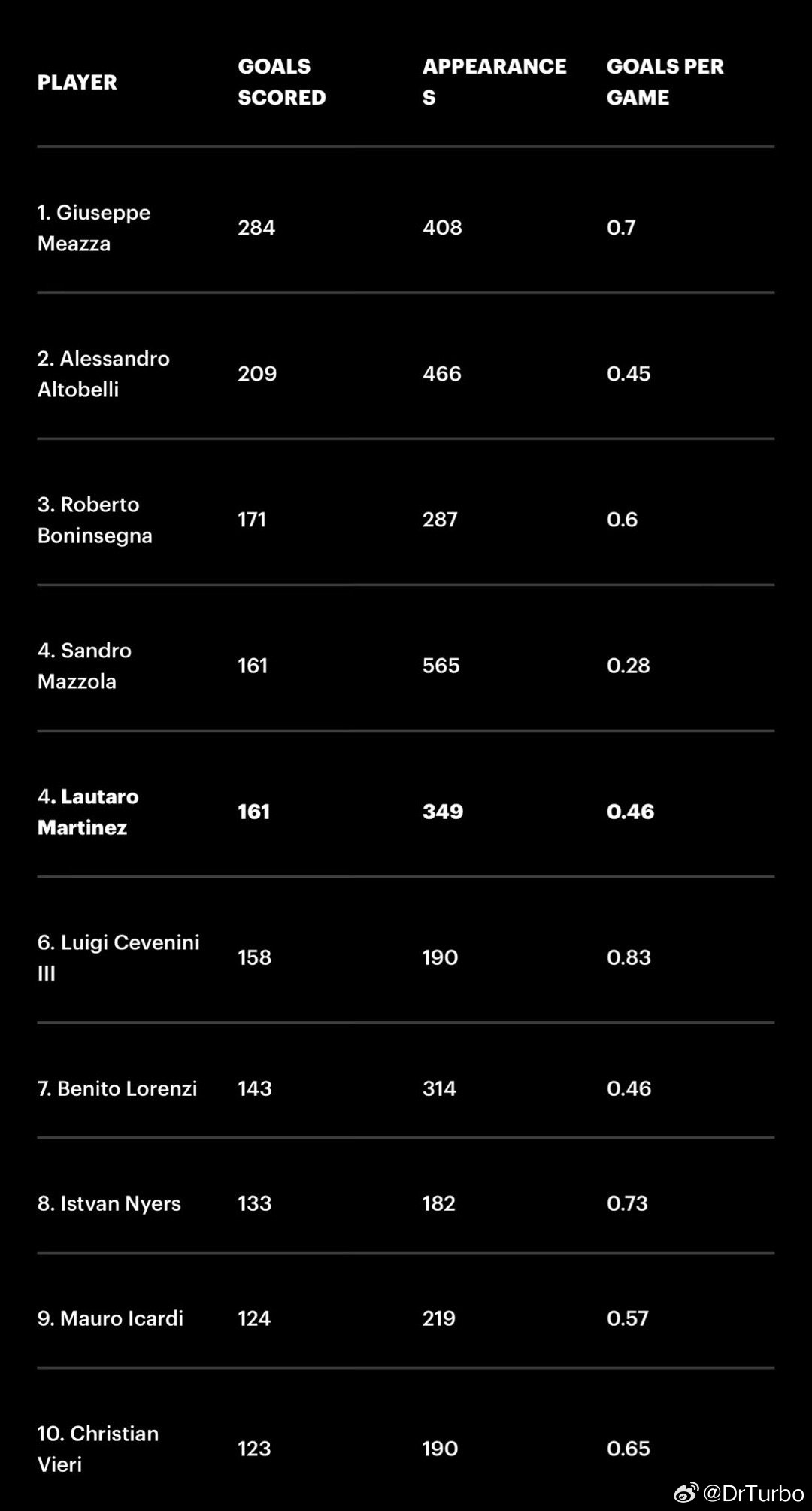 以下是国米队史射手榜 以及各自的出场次数和进球效率国际米兰2比0拉齐奥国际米兰热点现场