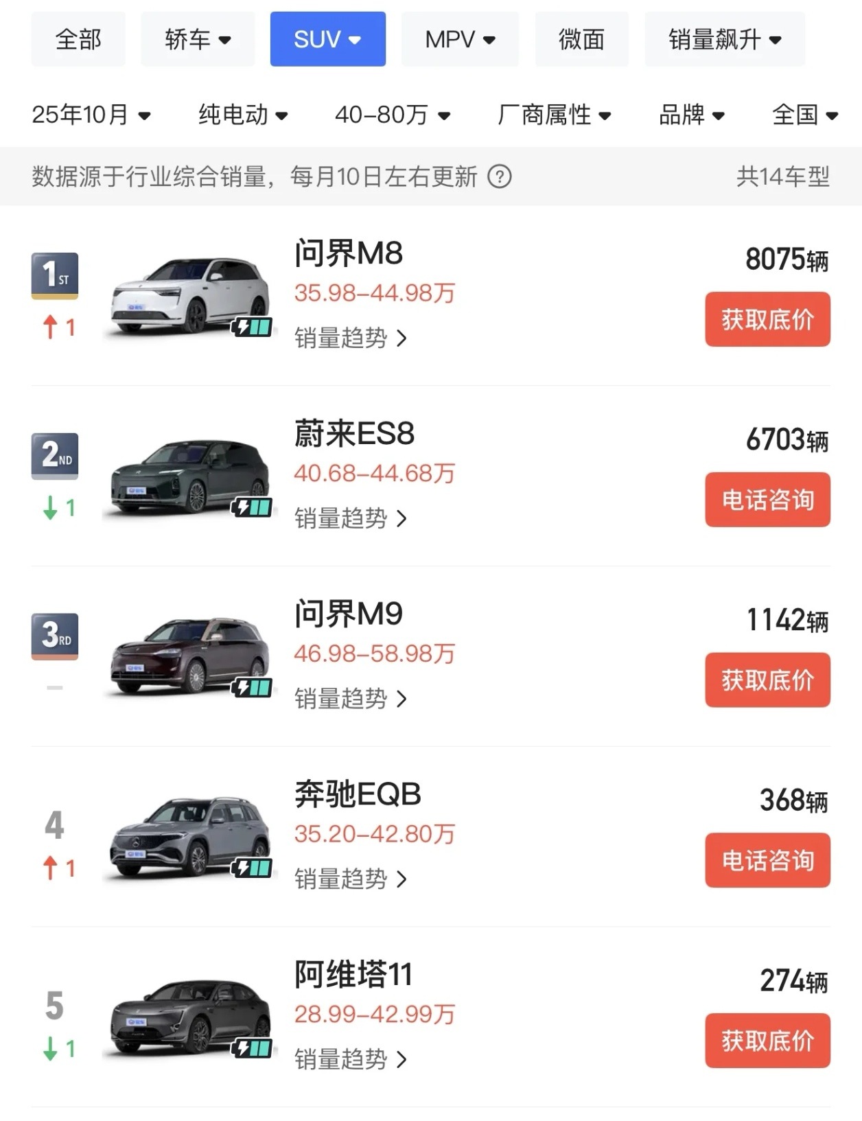 高端纯电确实迎来了春天,问界M8EV上个月卖了8000多辆!蔚来ES8是6703辆。