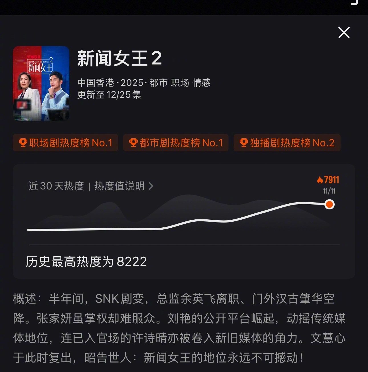 新闻女王2评分7.9,热度突破8200,依然是高热度高口碑,内娱就应该多拍这种好剧啊!