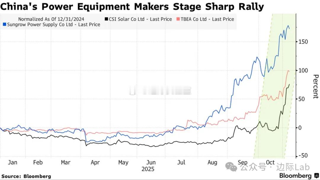 受人工智能数据中心建设将引发电力需求激增的预期驱动,中国电力设备制造商的股价自2025年第三季度末开始出现急剧拉升。瑞银集团已预测中国将开启持续10年电力超级周期,2028-2030年中国电力需求年增速将从当前的4%飙升至8%。