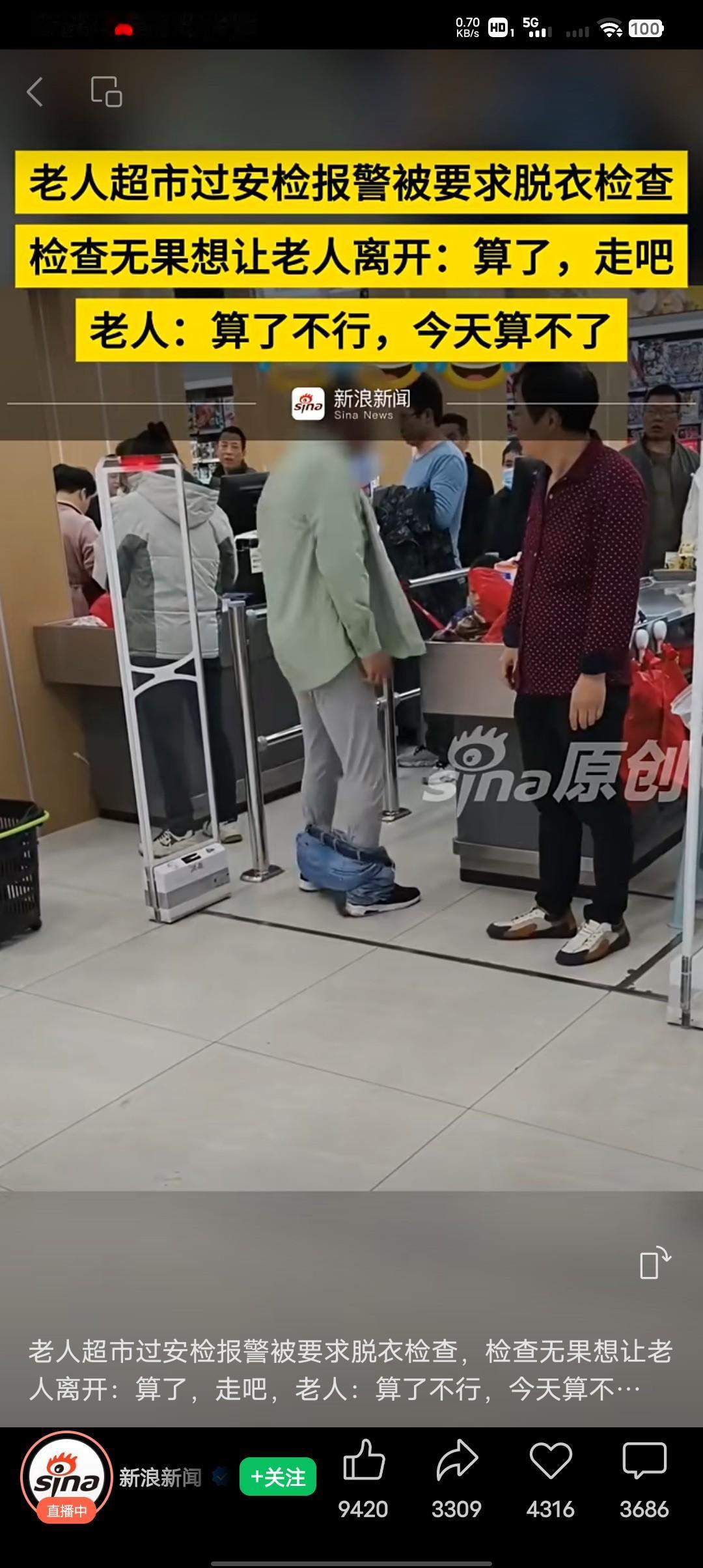 “算了不行,今天这事算不了,今天要给我一个很好的交代”老人很激动的说。 事情是这样的,老人超市过安检报警被要求当场脱衣服检查,检查无果后,想让老人离开。 老人把衣服都脱完了,只剩下一件衣服,11月10日柘皋派出所已接到报警,最后柘皋县政府工作人员回应是个误会,是机器老化出现故障误报警。最后经过调解双方线下达成和解老人自行离开。 首先我支持老人的的声讨,你一句机器老化就算了,我的人格受到的侮辱怎么算,大庭广众之下那么多人,让那么多人误会我买东西不给钱,还是偷东西呢?我没钱不买,但是我没做犯法的事,就不能接受这样的污蔑。