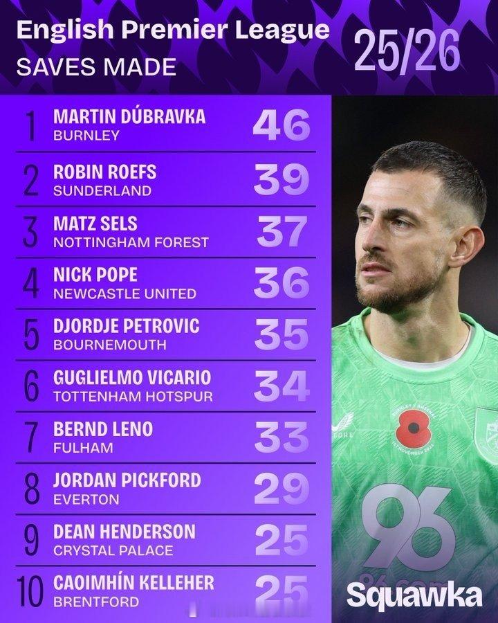 据数据统计:本赛季英超门将的零封和扑救情况,拉亚7次零封居首,杜布拉夫卡46次扑救最多 金秋观赛季 阿森纳著名教授