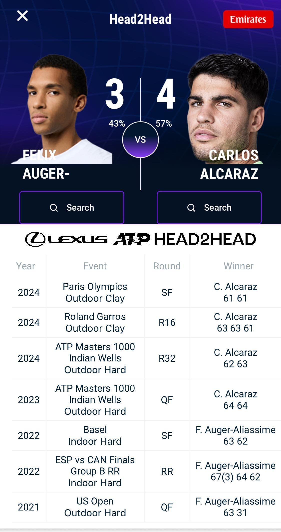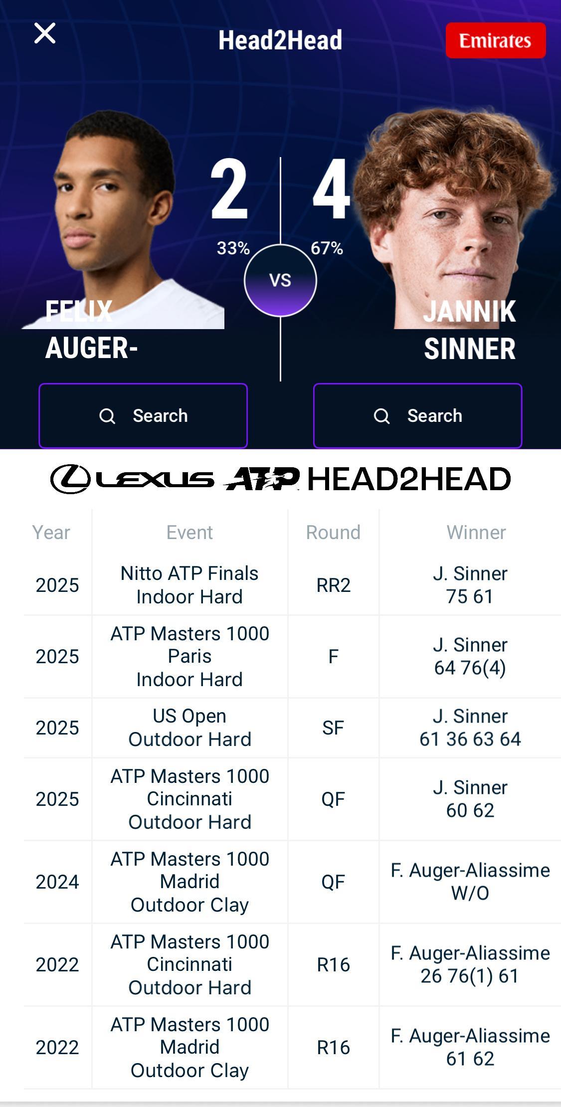 查了一下阿利亚西姆的高端头对头,还真不错诶!对德约1-1,对纳达尔1-2,对费德勒1-0,而且与三巨头的最后一次交锋(2022拉沃尔杯、2022总决赛、2021哈雷),获胜的都是他。但在辛纳阿卡面前,阿利亚西姆最初分别以2-0和3-0领先,现在分别被两大小魔头完成四连胜反超。