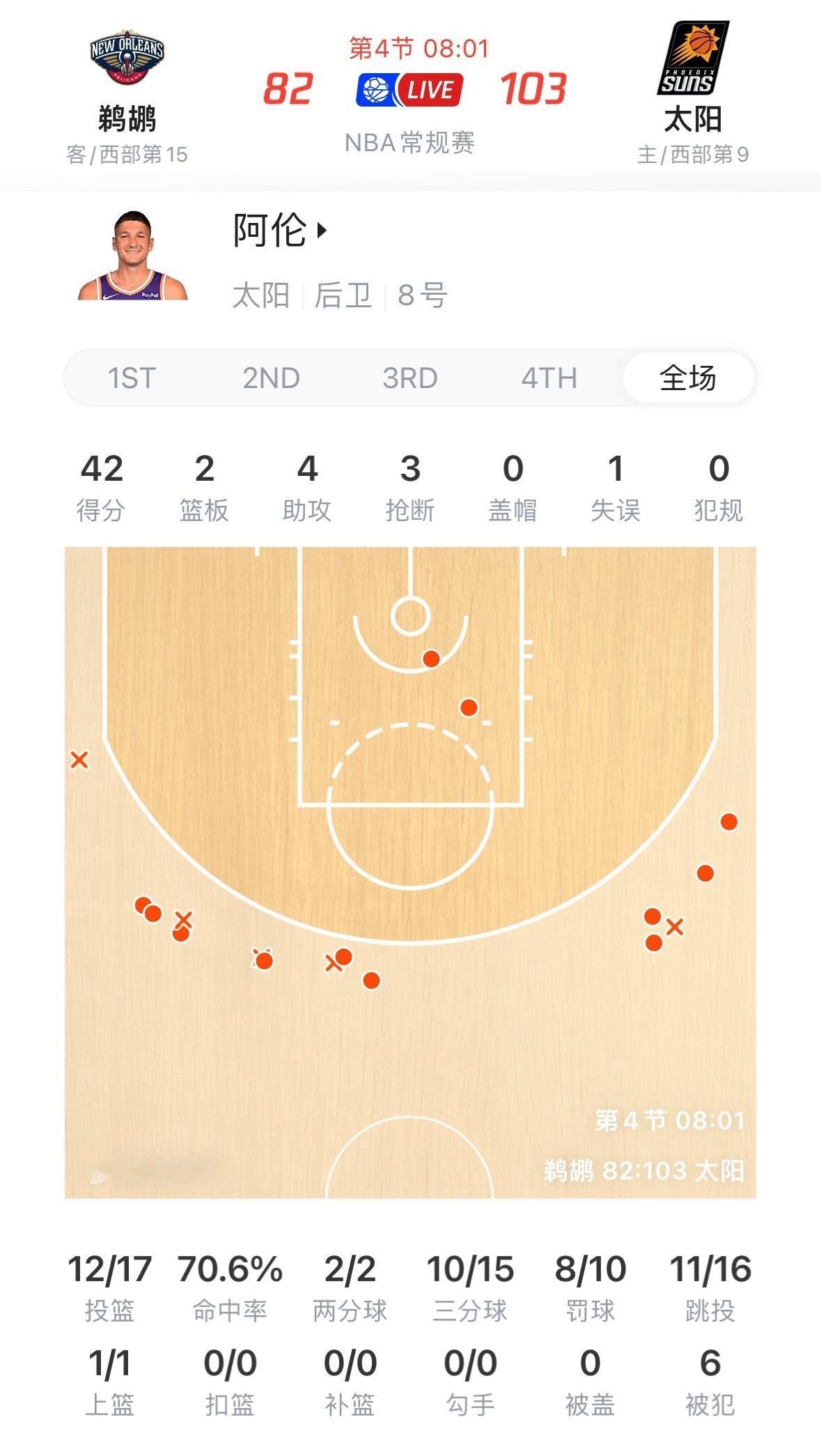 太阳队阿伦超神发挥!28分钟42分!三分15投10中!