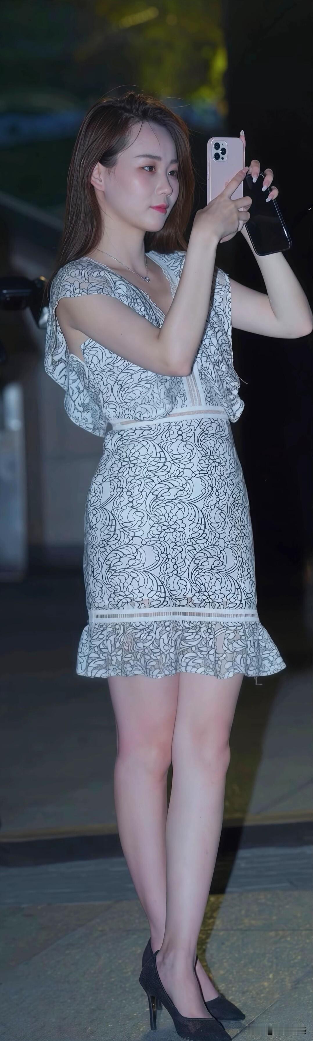 黑白花纹连衣裙配黑色高跟鞋,精致优雅。蕾丝设计与Fendi包,尽显时尚品味。