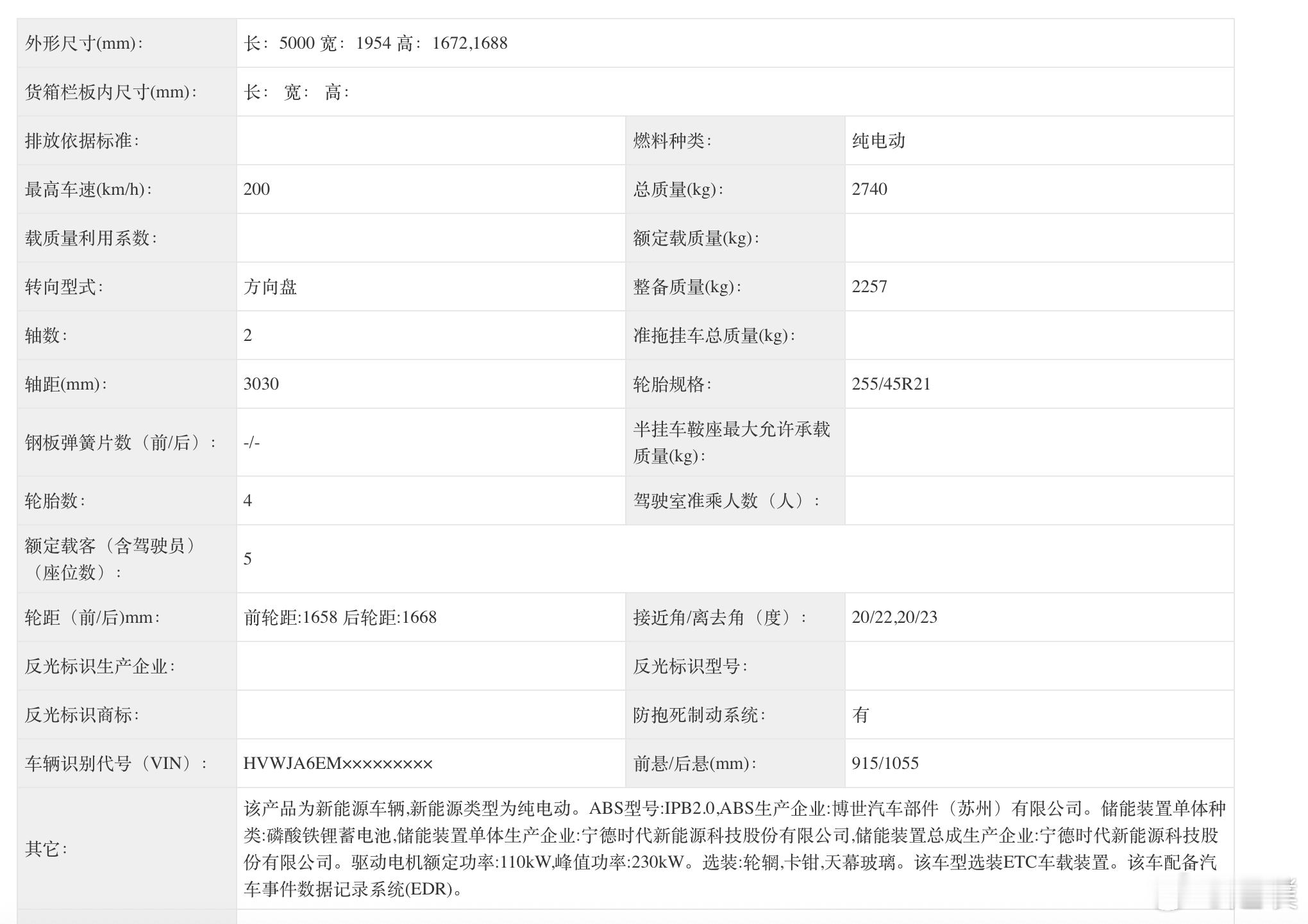 长宽高分别为5000*1954*1672(1688)mm,轴距为3030mm,有单电机和双电机两个动力版本,其中单电机最大功率为230kw,前后双电机最大功率分别为140kw和230kw。与众08