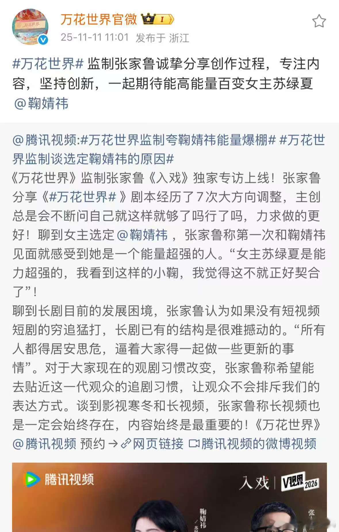万花世界监制夸鞠婧祎能量爆棚万花世界监制谈选定鞠婧祎的原因 鞠婧祎选角的背后,张家鲁的眼光实在太精准!他第一眼就感受到她与苏绿夏的气质不谋而合,她的能量简直是为角色量身定做!