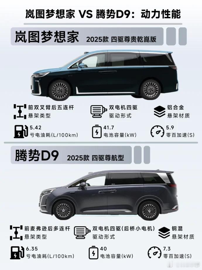 腾势D9前麦弗逊+后多连杆悬架,配备双电机四驱(后桥为小电机),纯电续航190km,百公里加速7.3s,钢混悬架材质与40kW电池容量满足使用需求。
