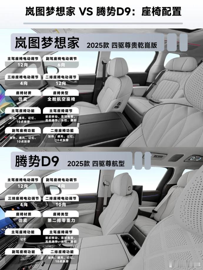 岚图梦想家:主驾12向、副驾6向、二排12向、三排4向电动调节,全舱航空座椅设计,仿皮材质细腻有品。前排均配加热、通风、记忆、10点按摩功能,二排同样豪华配置。