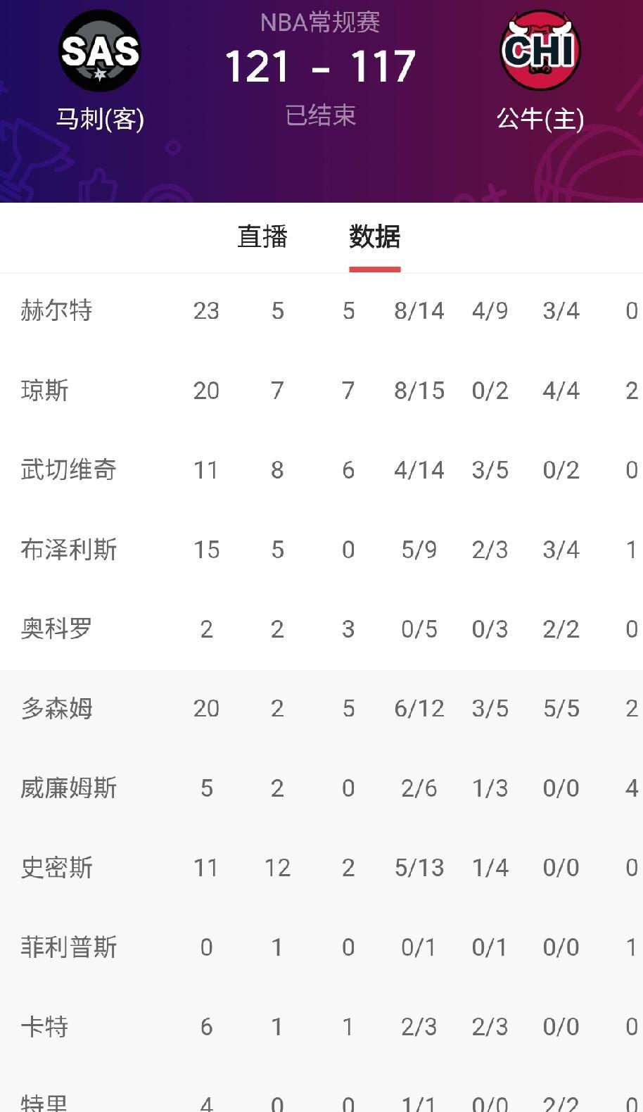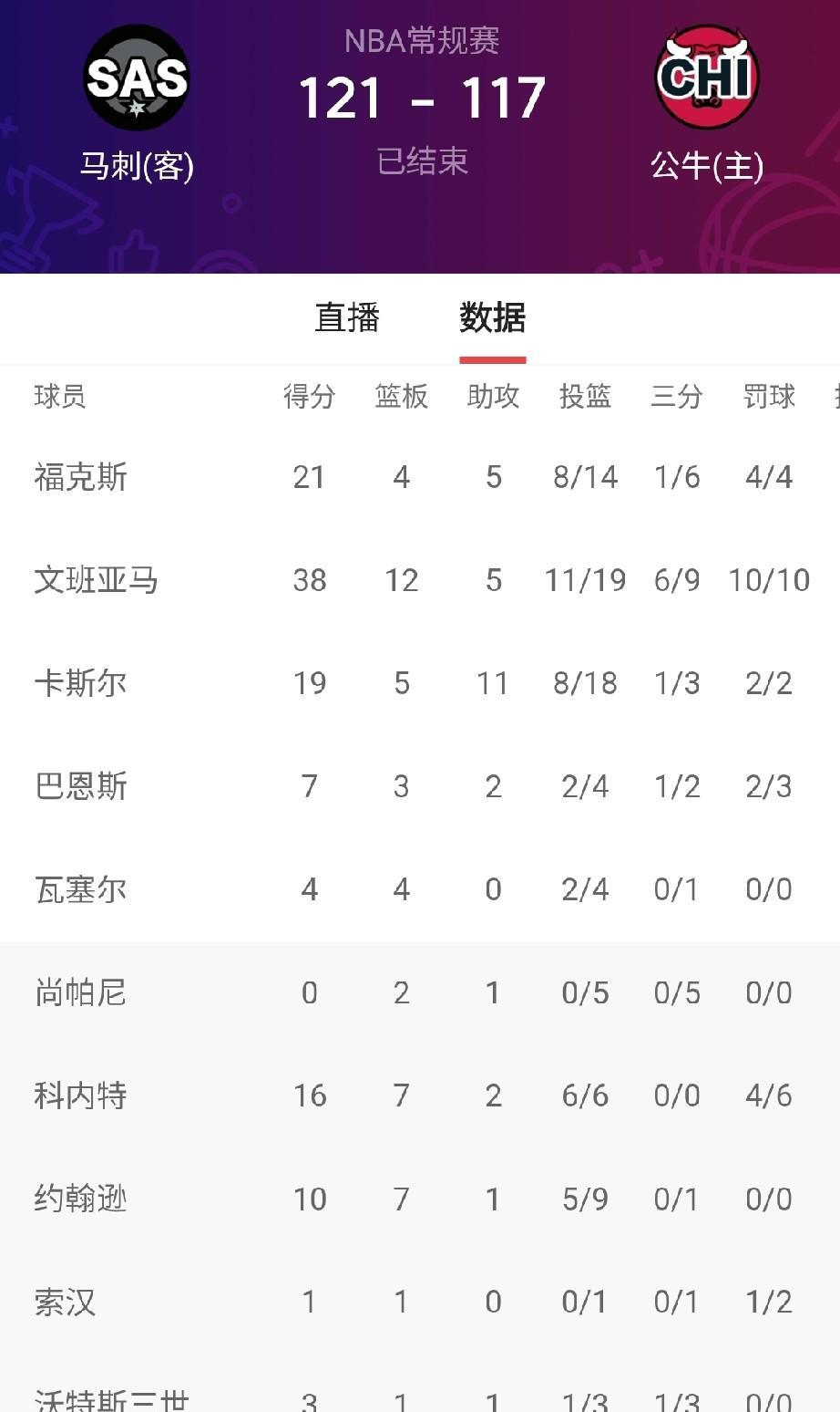 东西部势头正旺的两匹黑马决雌雄,马刺还是更盛一筹主场121-117逆转胜公牛。 公牛队也真不错,在缺少绝对核心吉迪的情况下,6人得分上双,与马刺鏖战到最后时刻,看起来是真长成熟起来了!