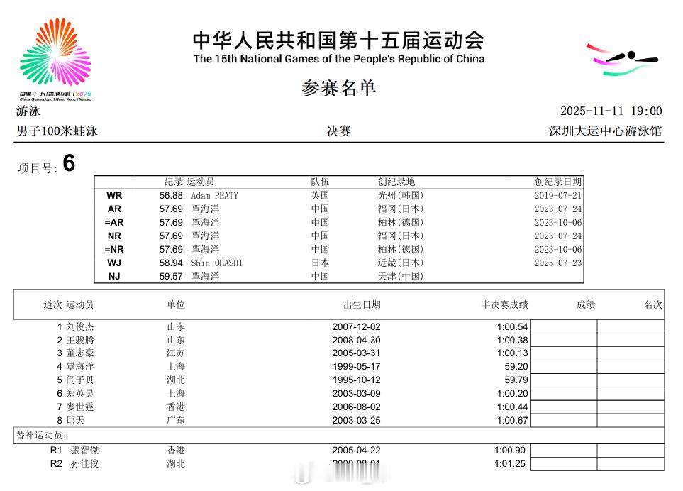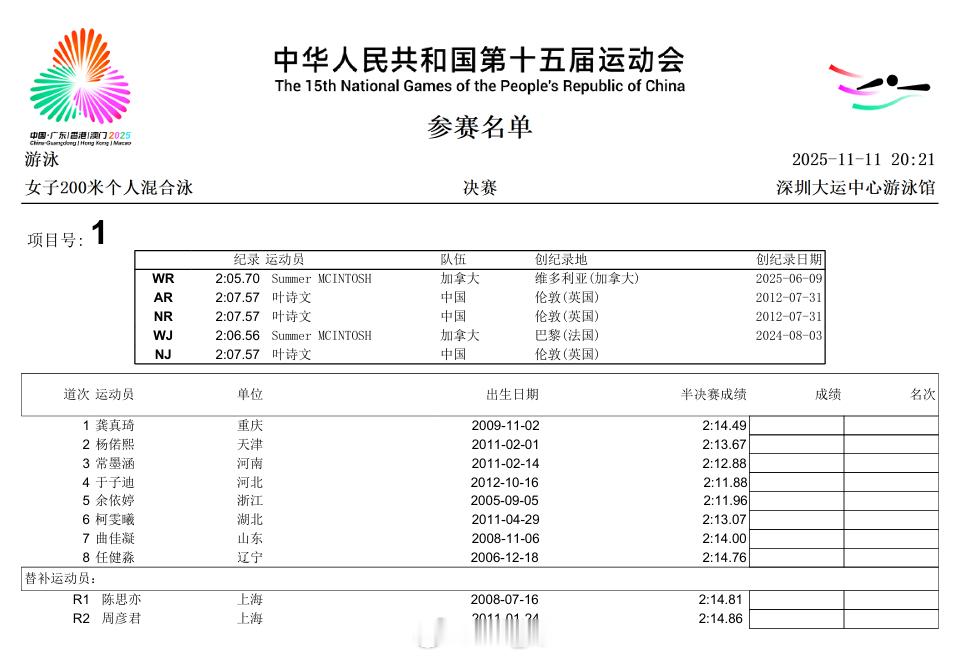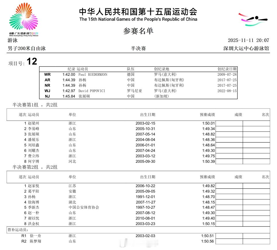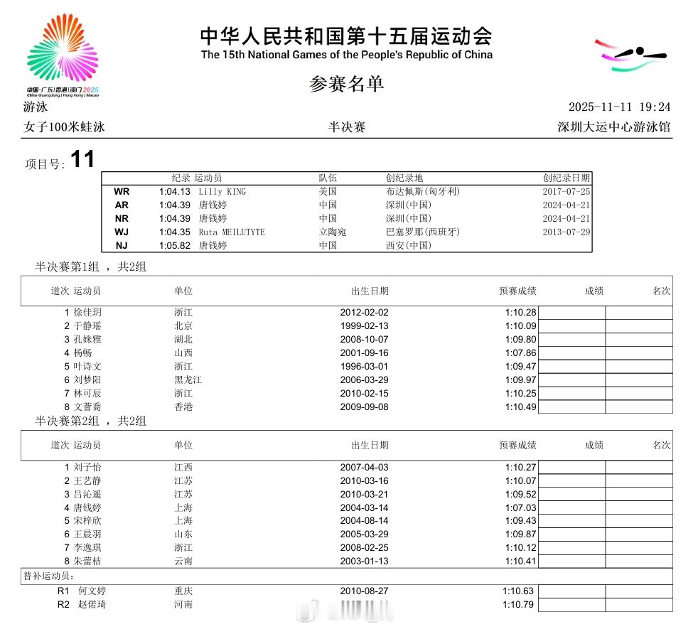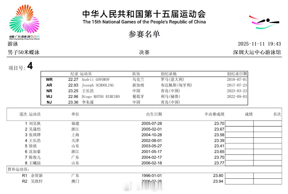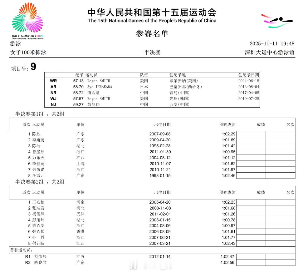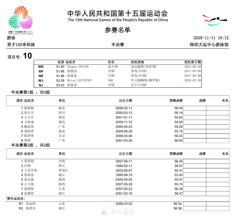 第十五届全国运动会 今晚决赛&半决赛秩序单,没有选手弃权