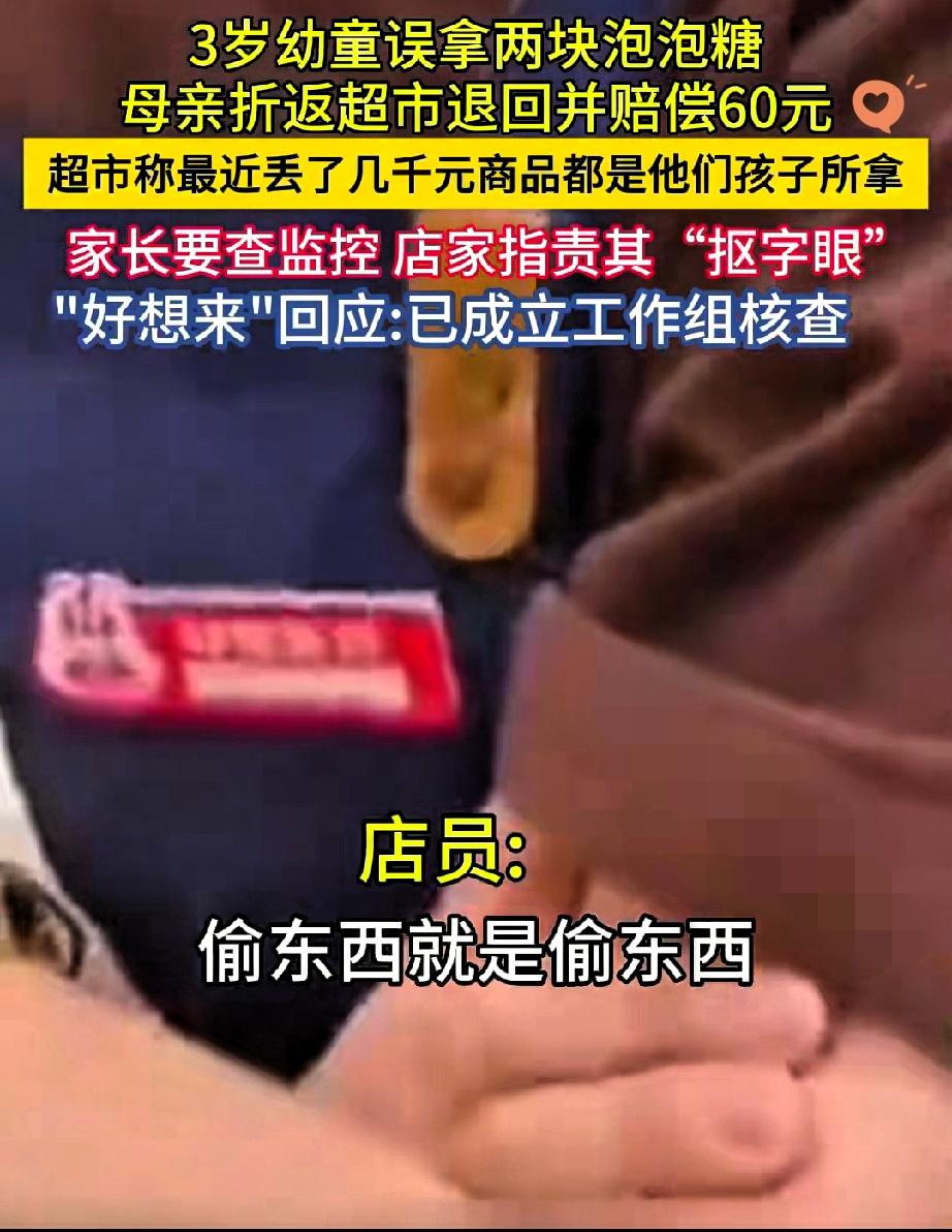 3岁娃误拿两块泡泡糖,妈妈主动折返退赔60元,这波教科书式教育本该被点赞,结果却被超市泼了盆冷水! 店家张口就说孩子偷拿过上千元商品,把妈妈直接整懵圈。 3岁娃连钱都没概念,哪能扛着几千块的东西溜出门? 真要是丢了这么多货,超市工作人员难辞其咎吧? 要求查监控还拿不出来,反而指责家长抠字眼,这操作实在让人看不懂。 其实这事儿根本不是钱的问题,妈妈是想给孩子树立规则意识,没想到店家的无理指控反而成了反面教材。 做生意讲诚信,空口无凭污蔑顾客,只会砸了自己的招牌。 到底是超市想“碰瓷”,还是真有误会? 你觉得3岁孩子能悄悄拿走上千元商品吗?来评论区说说你的看法~