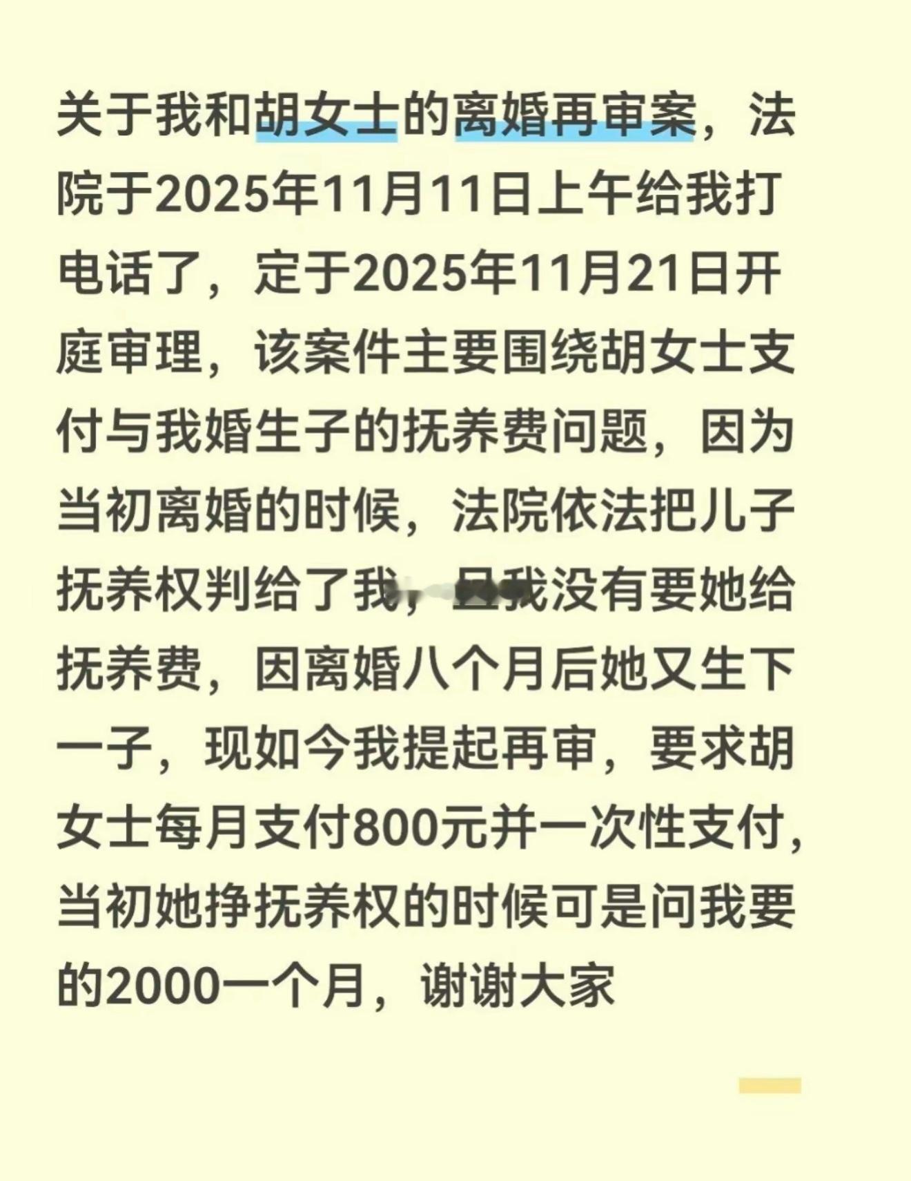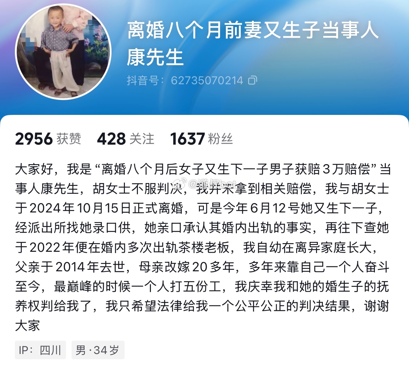 离婚8个月后前妻生子,男方称前妻在婚内出轨,对象是打麻将认识的,起诉后一审获赔3万精神损失费,如今再提起申诉要求胡女士每月支付800元抚养费。