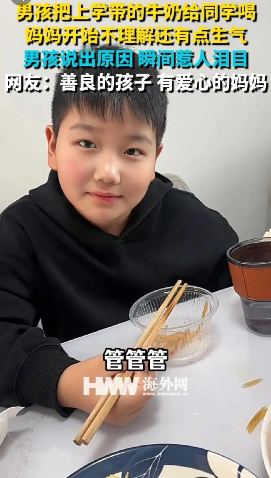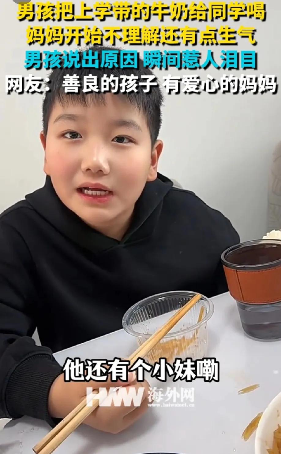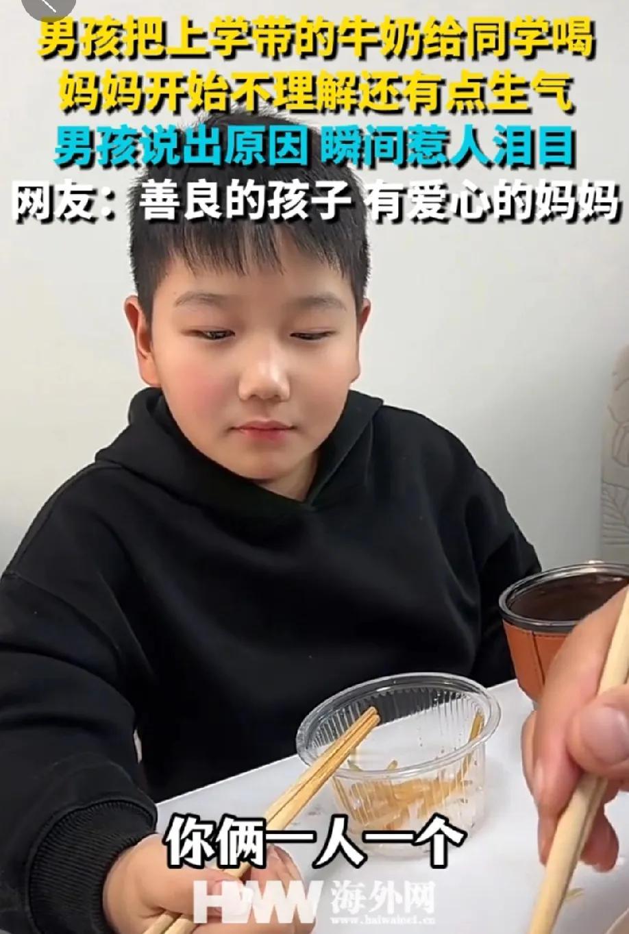 一男孩把上学带的牛奶给同学喝,妈妈不理解还有点生气。当男孩说出“他没有妈”,妈妈明显迟疑了。我听到心里也咯噔一下,鼻子酸酸的,当妈的都听不得这句话。 接下来妈妈的话“那你那你下回拿两个”“管管管”,看到这个,我又相信世界上善良的人还很多。善良的孩子背后是善良的家长! 相由心生,这么善良的孩子面相看着就很舒服,宁可自己不喝,也要给自己的牛奶给同学喝,还有同学的妹妹喝。善良的孩子,妈妈的爱心温暖了孩子的心灵,最好的家教莫过于此。 很多时候善良的付出,我们又会担心对方会不会成为理所应当。但行好事莫问前程,希望善良的人都能有善报!