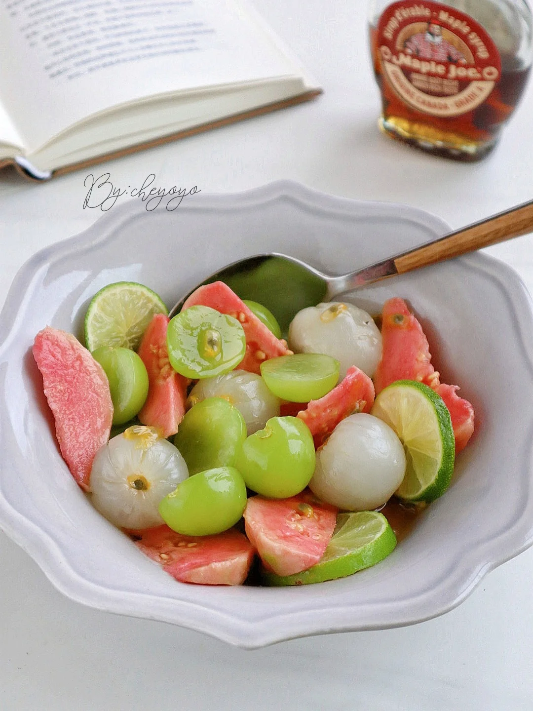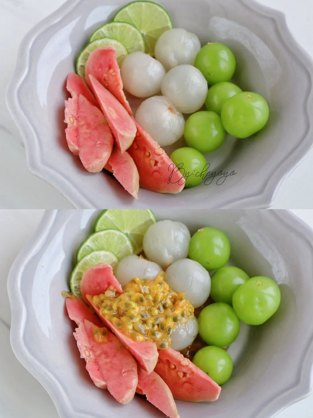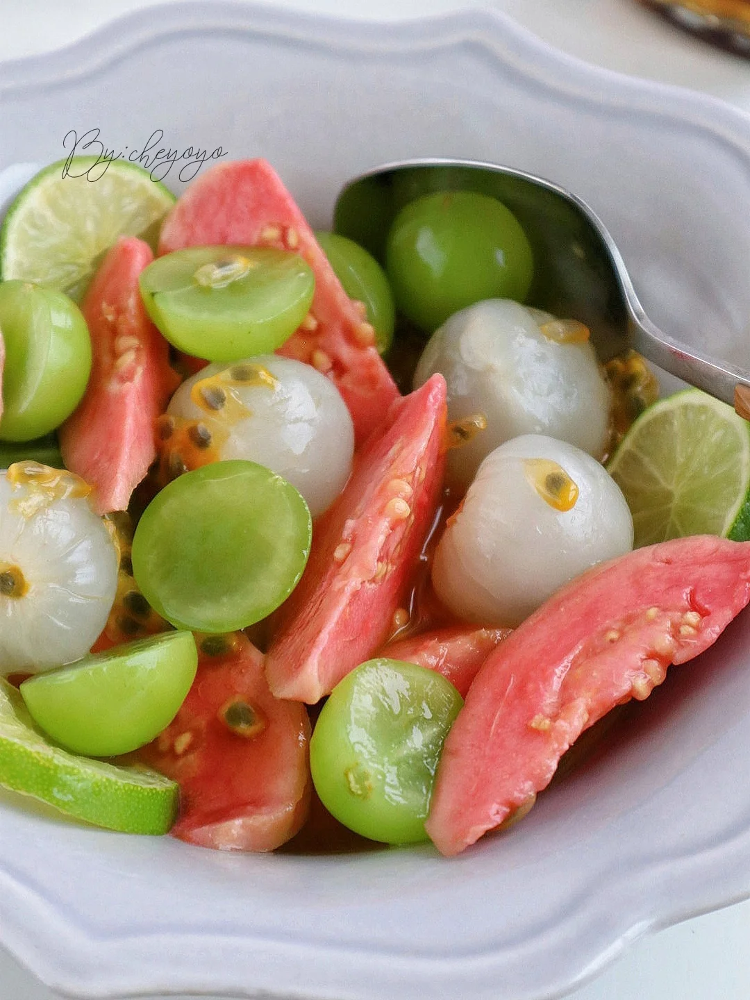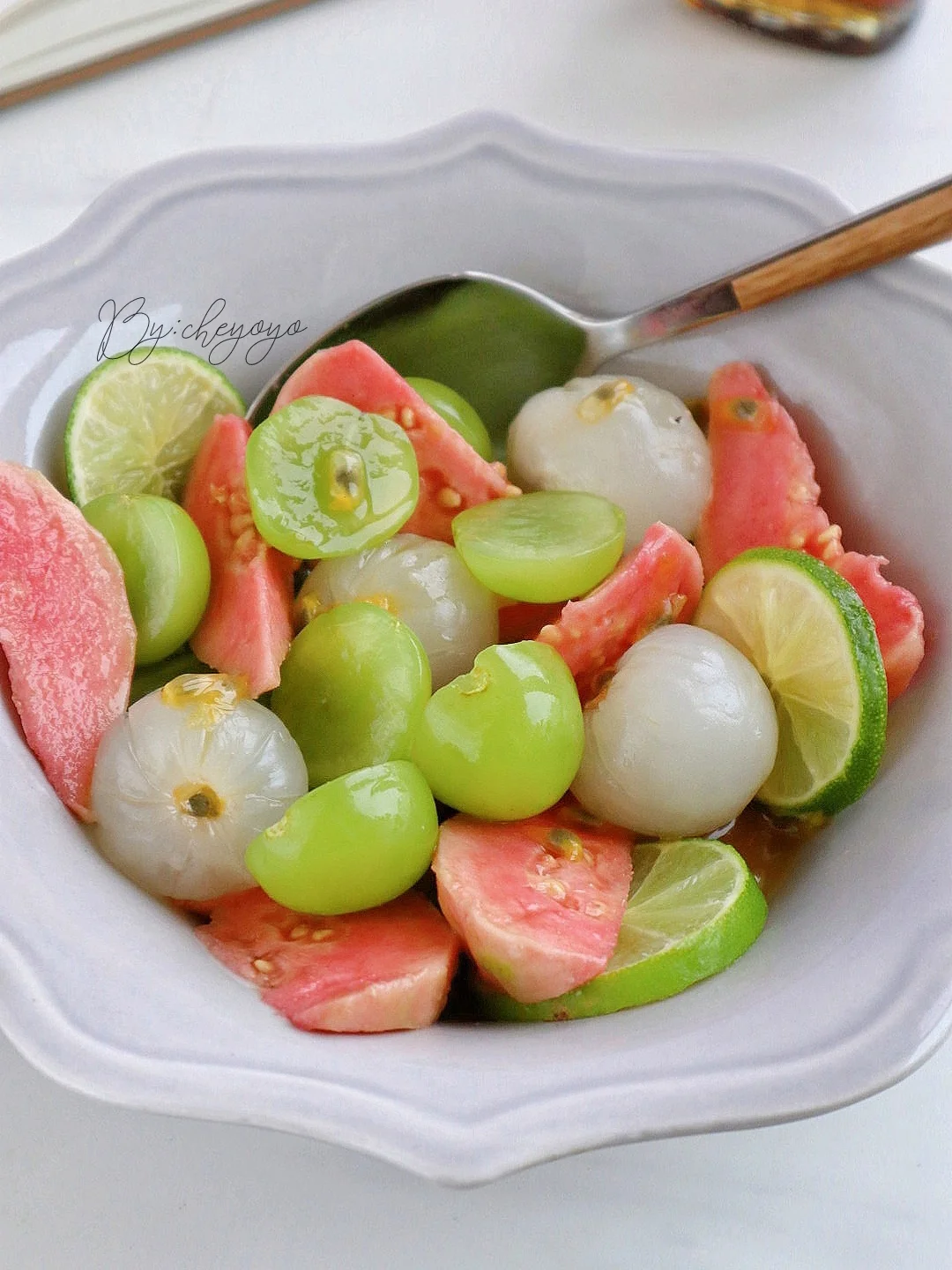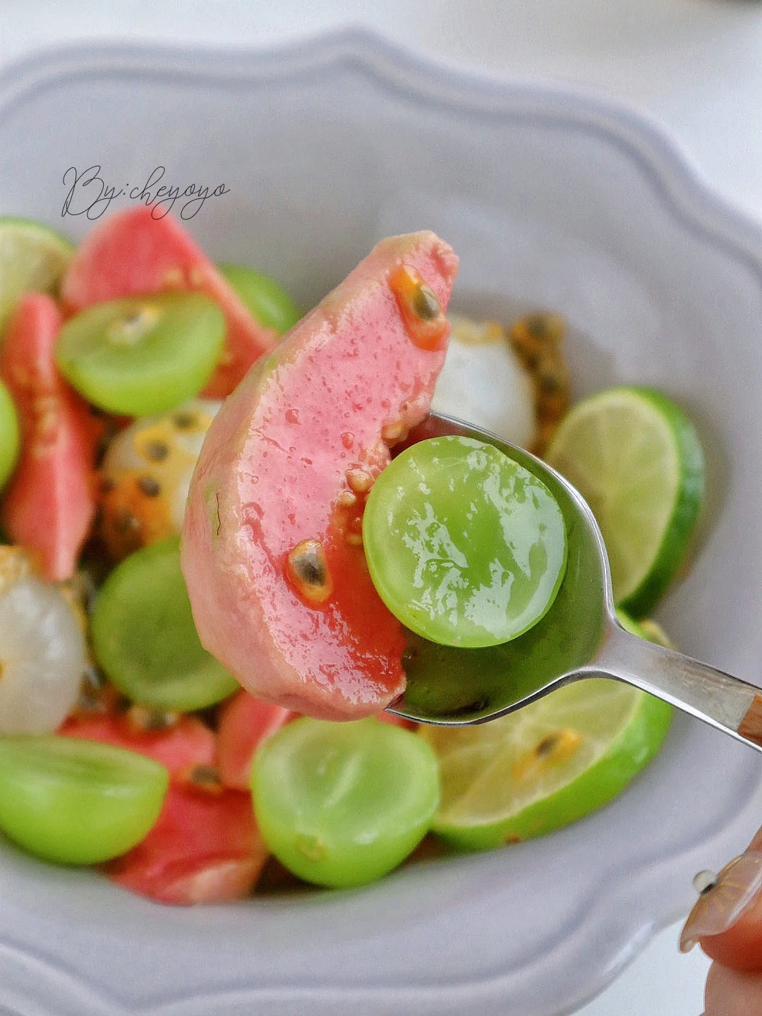 一代人有一代人的凉拌菜!百香果渍万物,果香浓郁、酸甜清爽,冰冰凉凉解暑又好吃,怎么都吃不腻😋 - 🌟食材🌟 百香果、荔枝、阳光玫瑰、草莓芭乐、蜂蜜 - 🌟做法🌟 1⃣️荔枝去壳,芭乐切块,阳光玫瑰切半; 2⃣️加入百香果和蜂蜜翻拌均匀,送入冰箱冷藏2小时就ok啦😌😌