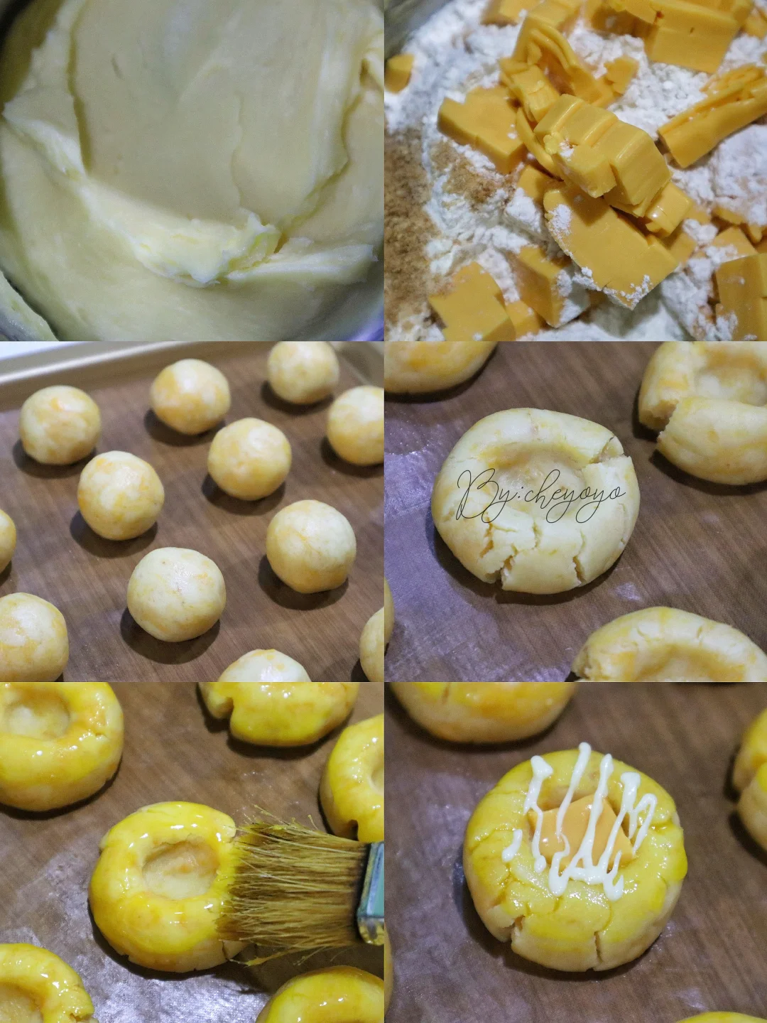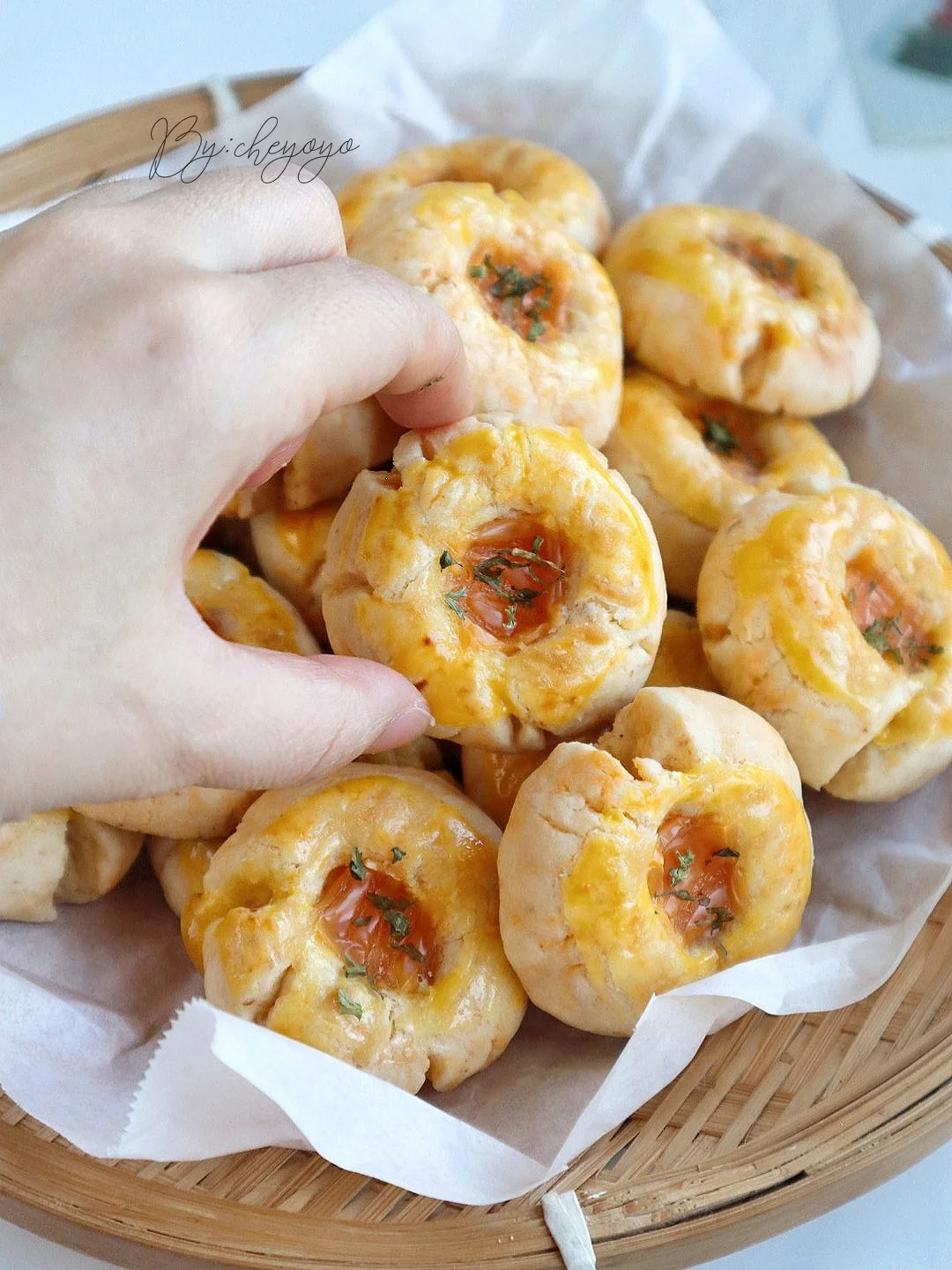 4⃣️ 表面刷蛋黄液,中间放切成小块的车达芝士片,挤上沙拉酱,再撒少许欧芹碎;