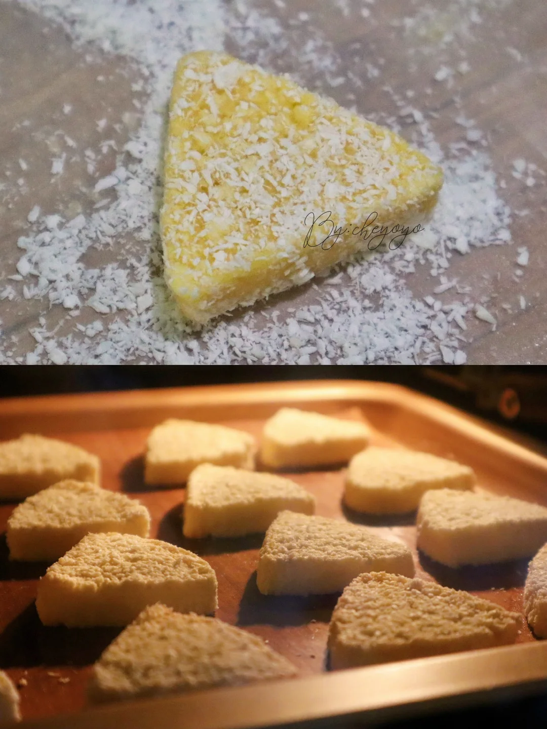 3⃣️切成1cm薄片,裹满装饰椰蓉后摆在烤盘上,送入170度烤箱烘烤18分钟左右就OK啦~😍