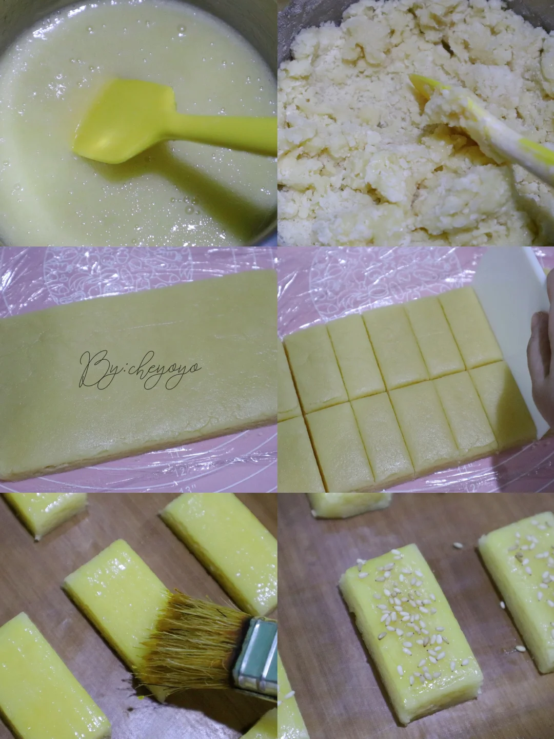 2⃣️ 面团擀成1cm厚的方形,均匀切成小方块,表面刷蛋黄液,撒上白芝麻;
