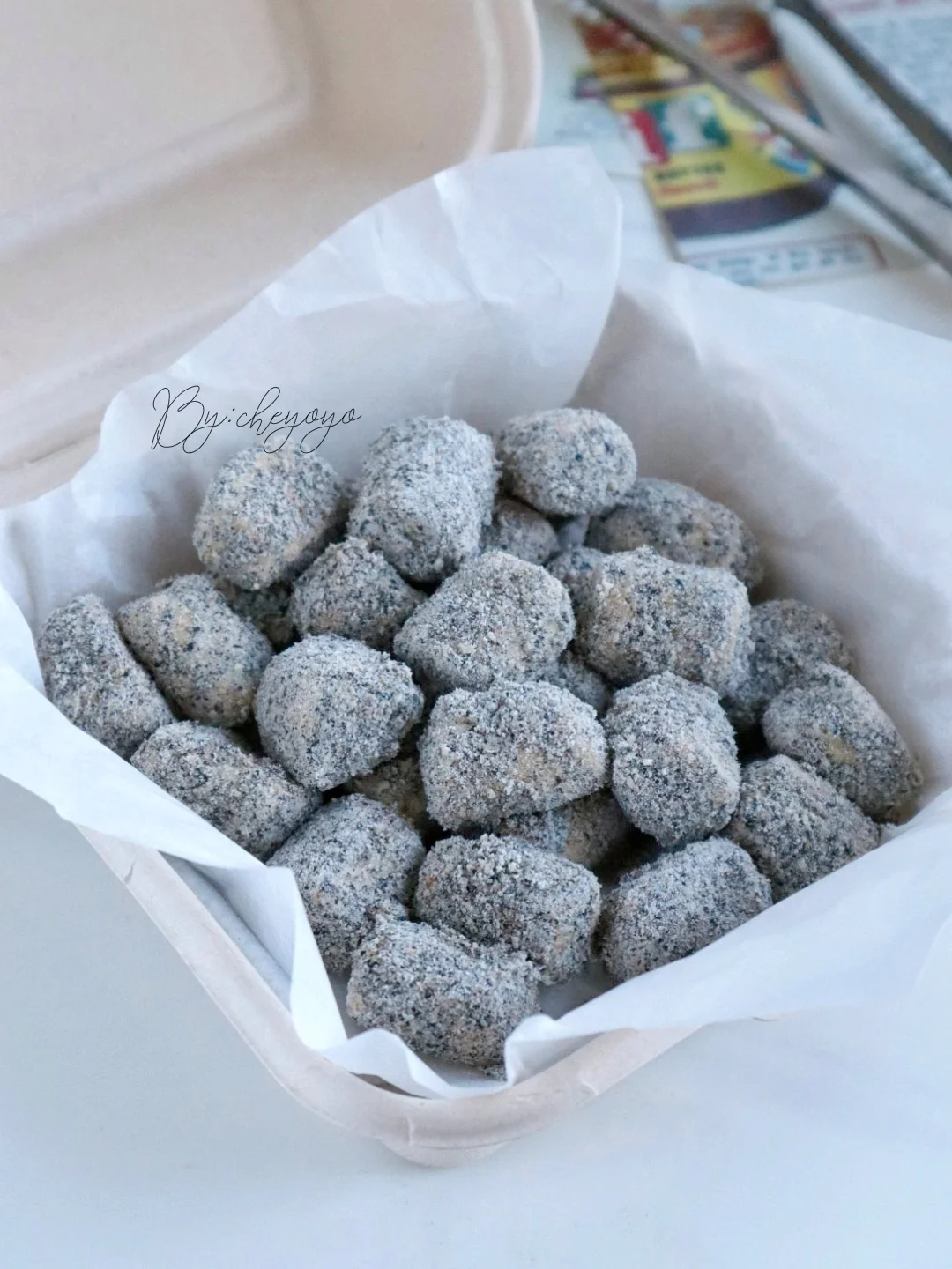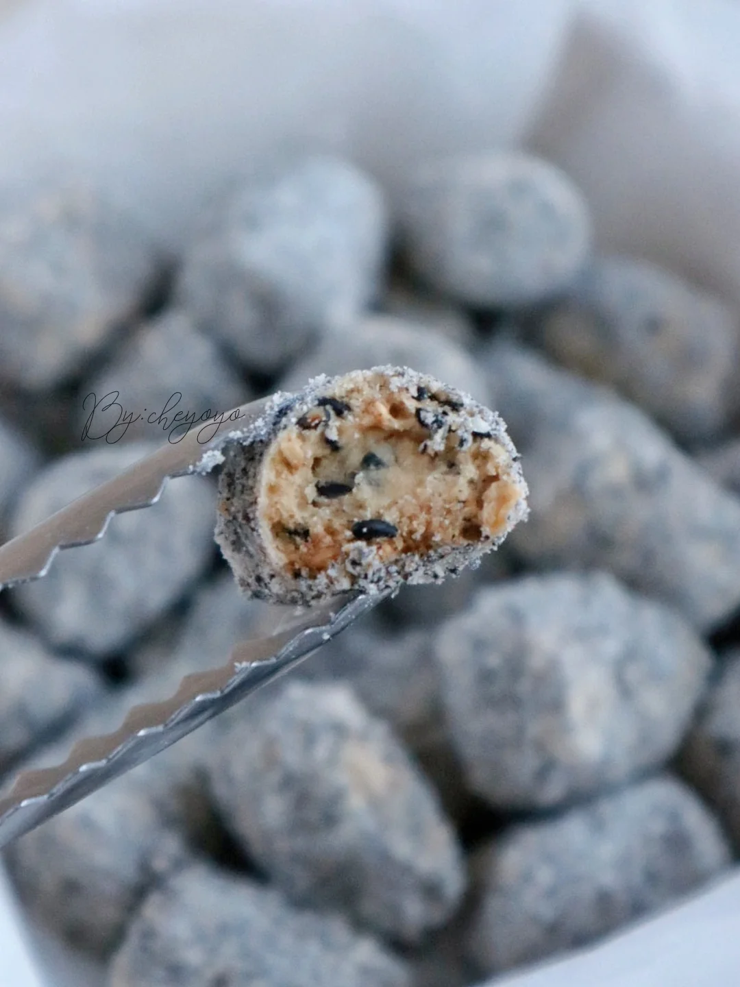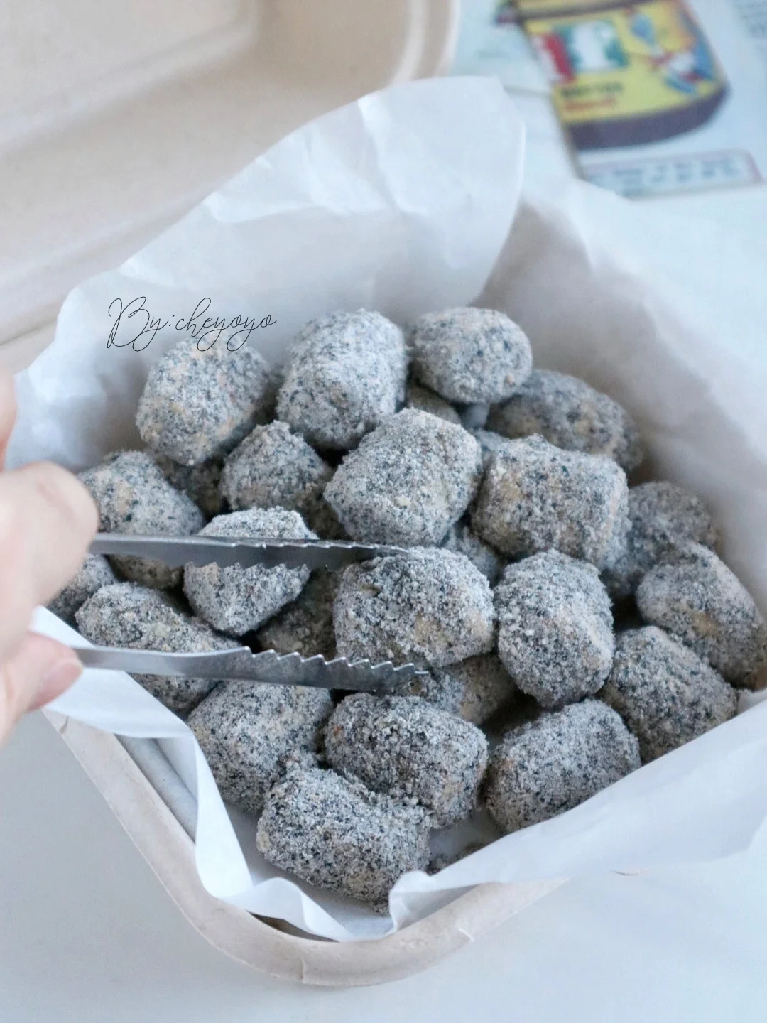 4⃣️ 送入150度烤箱烘烤30分钟,冷却至体温时放入黑芝麻雪绒粉中裹匀就ok啦🤗🤗