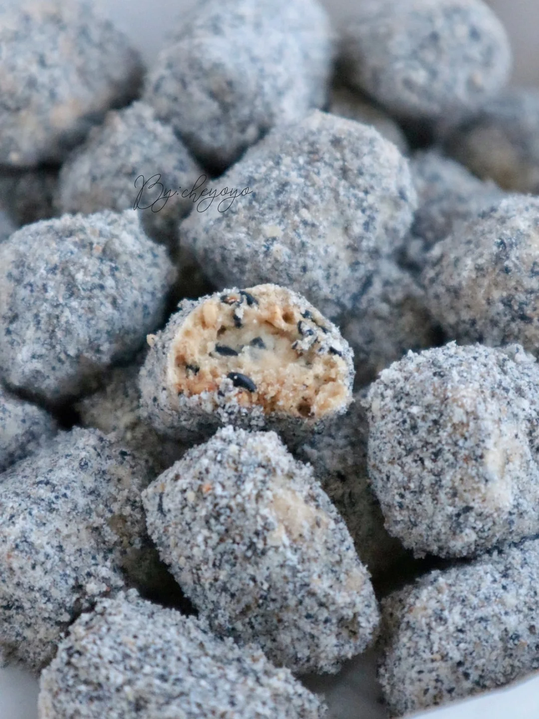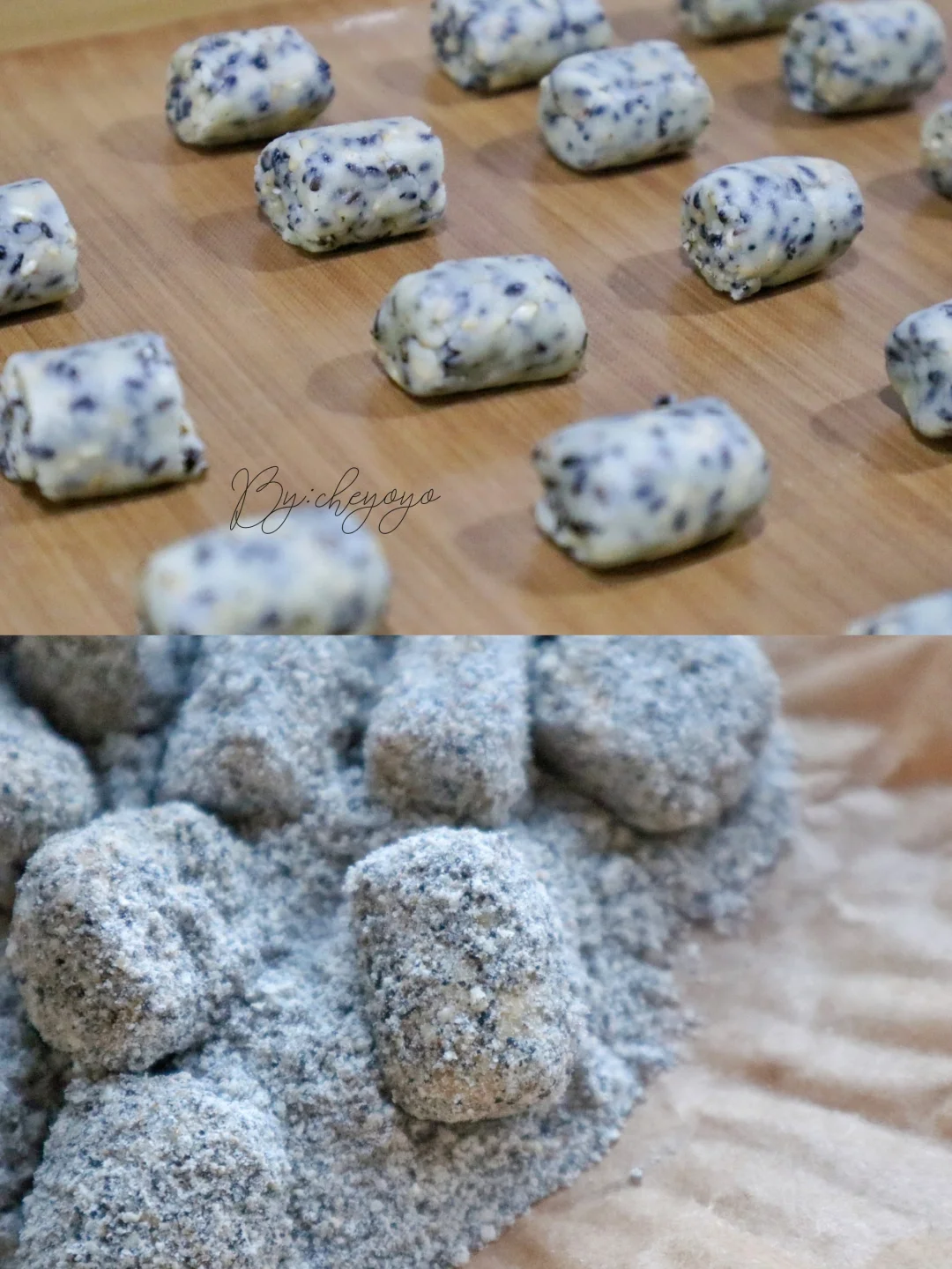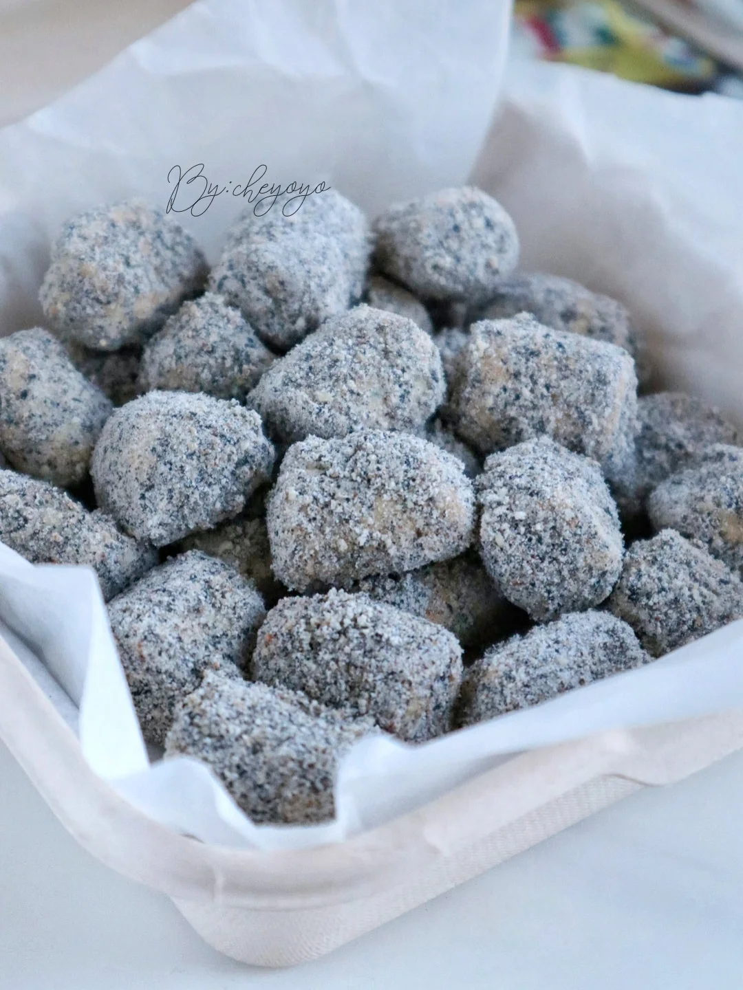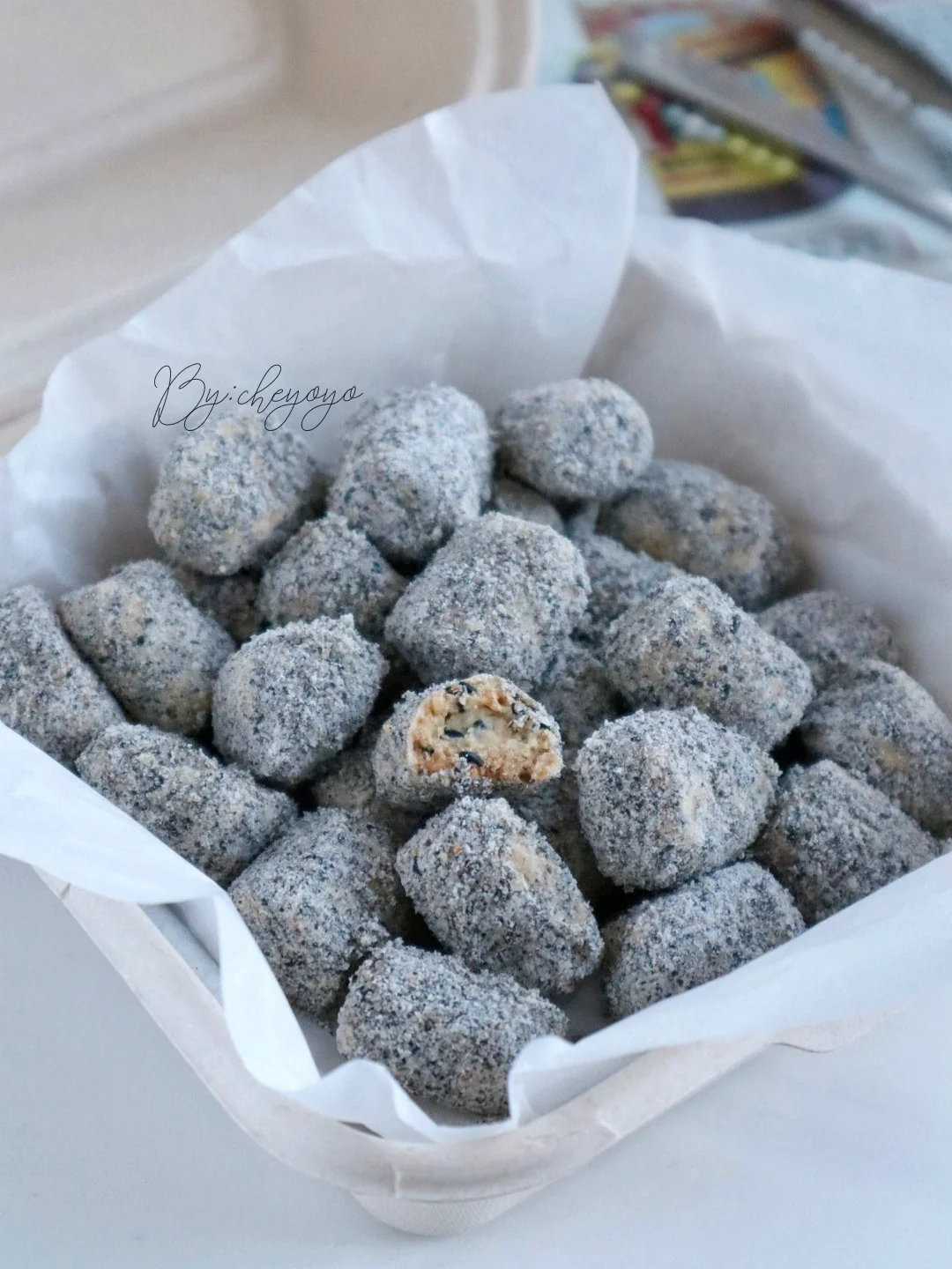 4⃣️ 送入150度烤箱烘烤30分钟,冷却至体温时放入黑芝麻雪绒粉中裹匀就ok啦🤗🤗